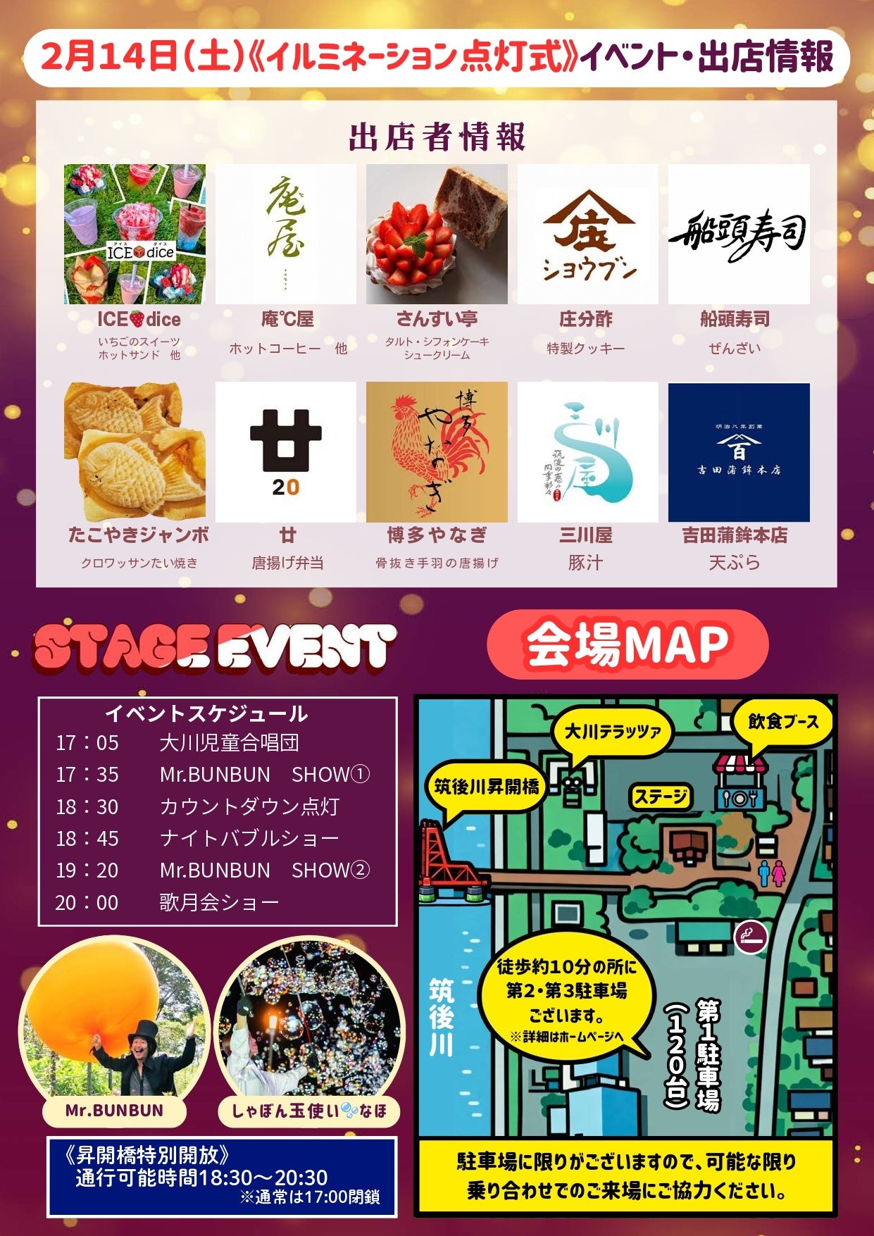 2月14日の点灯式イベントではカウントダウン点灯、大道芸、ナイトバブルショー等のステージイベントのほか、スイーツや温かい食べ物を楽しめる飲食店が出店します。