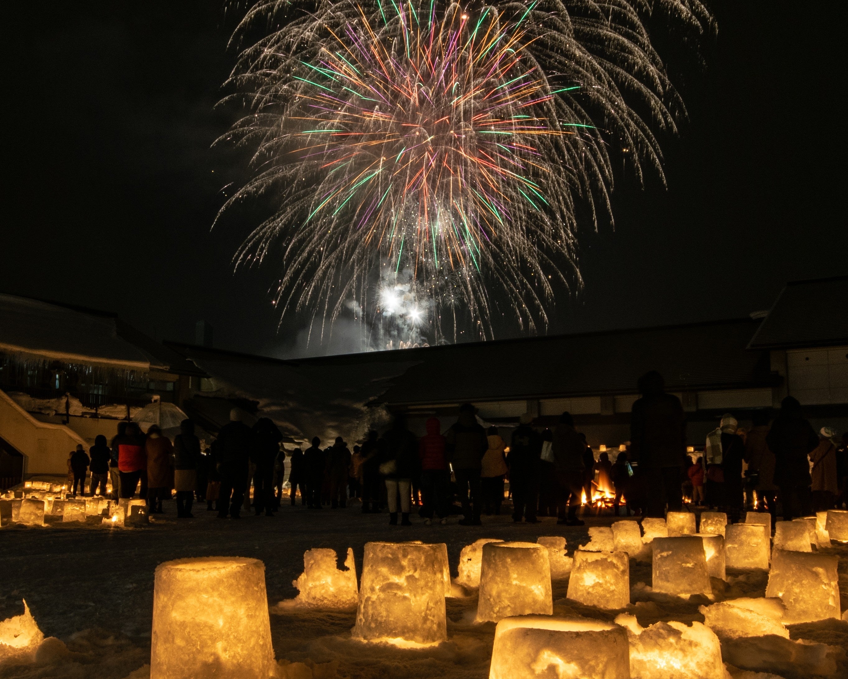 地上で揺らめくスノーキャンドルの優しい灯りと頭上に広がる大輪の花火。地上と夜空が一体となって光り輝く、この日、この場所でしか見られない幻想的なフォトジェニックな景色をお届けします。