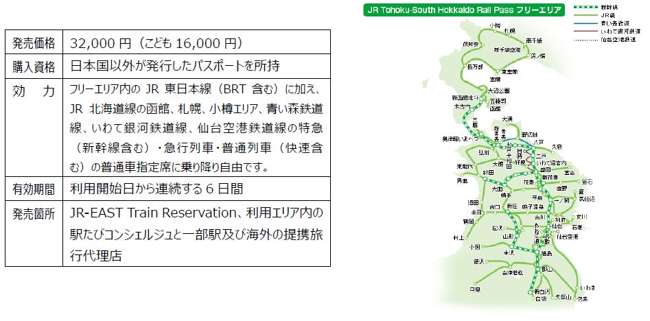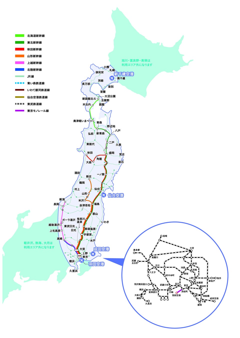 JR東日本線全線(BRT含む)、東京モノレール線全線、青い森鉄道線全線、いわて銀河鉄道線全線、仙台空港鉄道線全線、三陸鉄道線全線、北越急行線全線、えちごトキめき鉄道(直江津~新井間)の特急(新幹線含む)・急行列車・普通列車(快速含む)の普通車指定席およびJR・東武相互直通特急「日光号」「スペーシア日光号」「きぬがわ号」「スペーシアきぬがわ号」などの特急列車の普通車指定席に乗り降り自由です。JRバスの一部路線もご利用になれます。 |