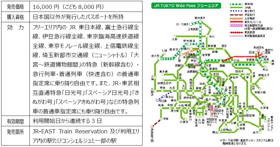 フリーエリア内のJR東日本線に加え、JR西日本線の北陸エリア、京阪神エリア、東京モノレール線の特急(新幹線含む)・急行列車・普通列車(快速含む)の普通車指定席に乗り降り自由です。 |