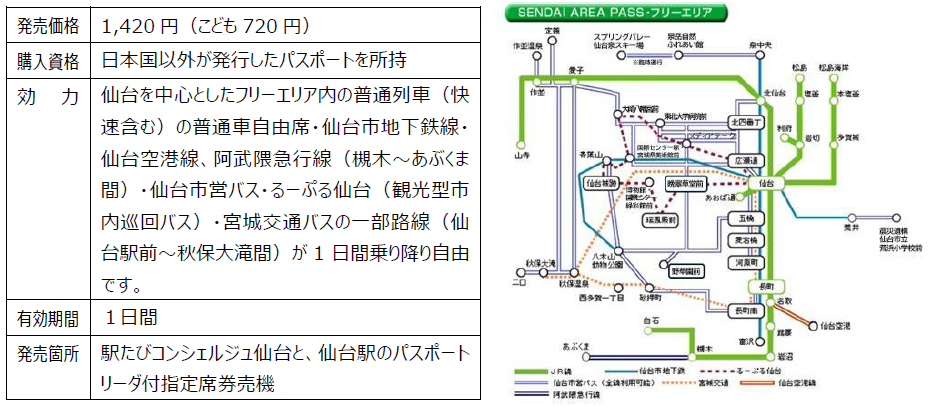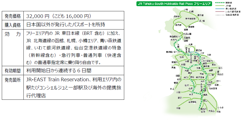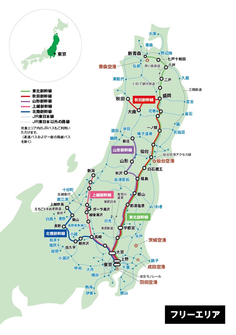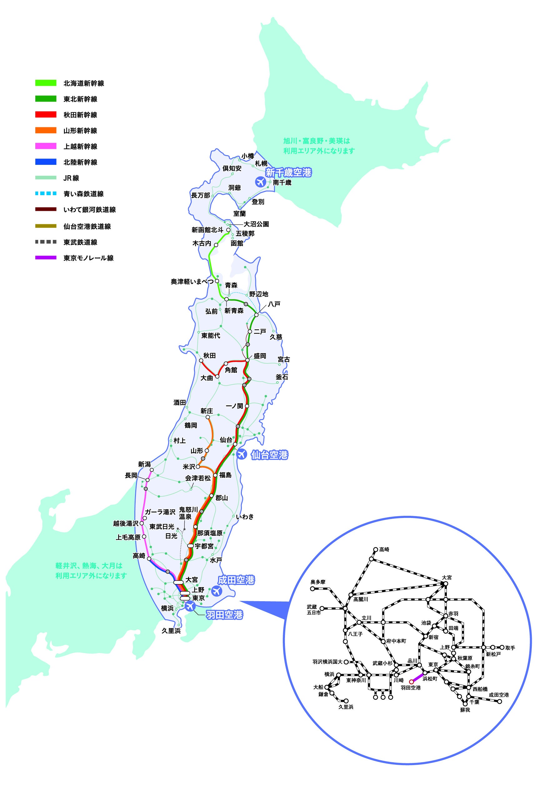 JR東日本線全線(BRT含む)、東京モノレール線全線、青い森鉄道線全線、いわて銀河鉄道線全線、仙台空港鉄道線全線、三陸鉄道線全線、北越急行線全線、えちごトキめき鉄道(直江津~新井間)の特急(新幹線含む)・急行列車・普通列車(快速含む)の普通車指定席およびJR・東武相互直通特急「日光号」「スペーシア日光号」「きぬがわ号」「スペーシアきぬがわ号」などの特急列車の普通車指定席に乗り降り自由です。JRバスの一部路線もご利用になれます。 |