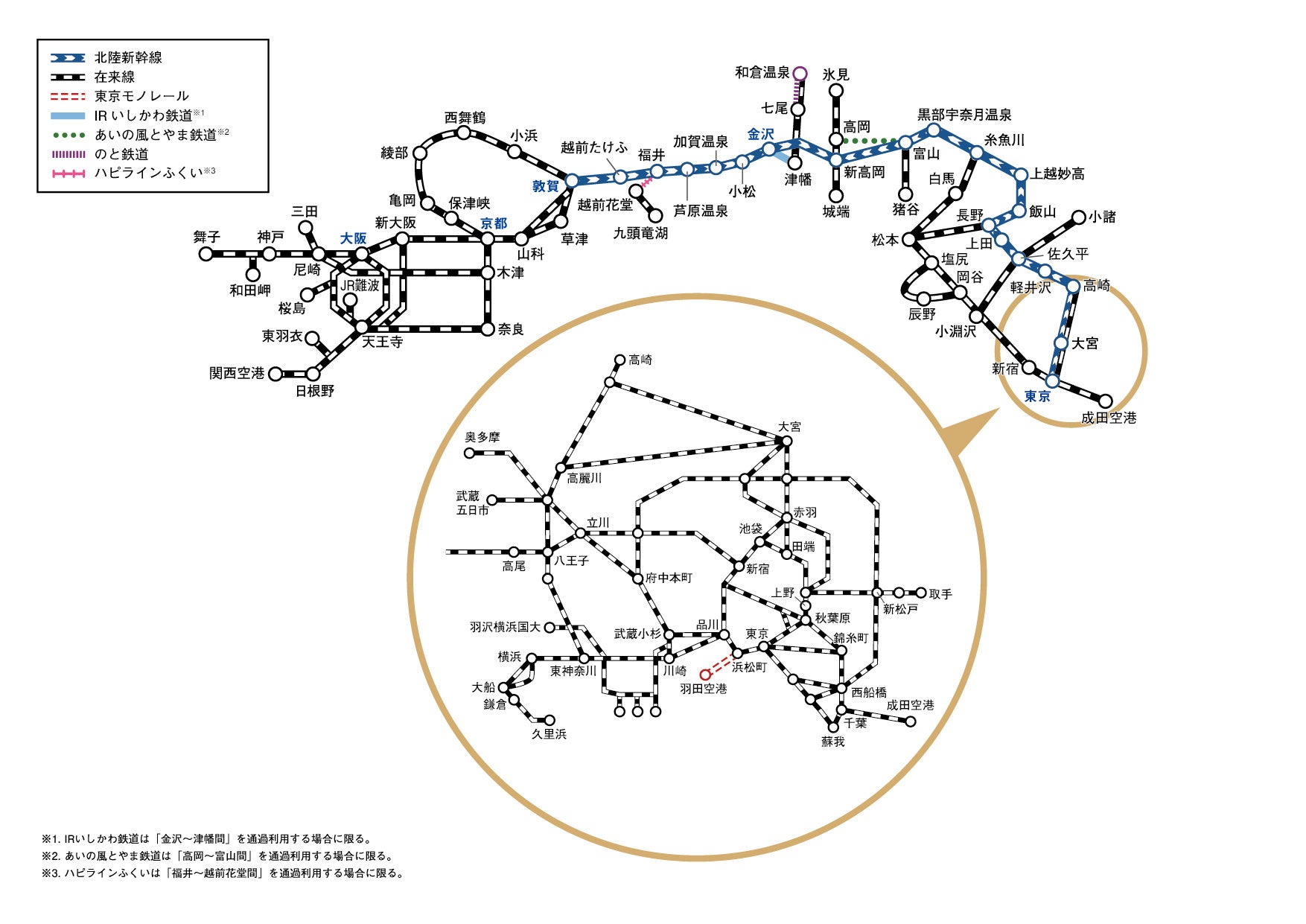 フリーエリア内のJR東日本線に加え、JR西日本線の北陸エリア、京阪神エリア、東京モノレール線の特急(新幹線含む)・急行列車・普通列車(快速含む)の普通車指定席に乗り降り自由です。 |