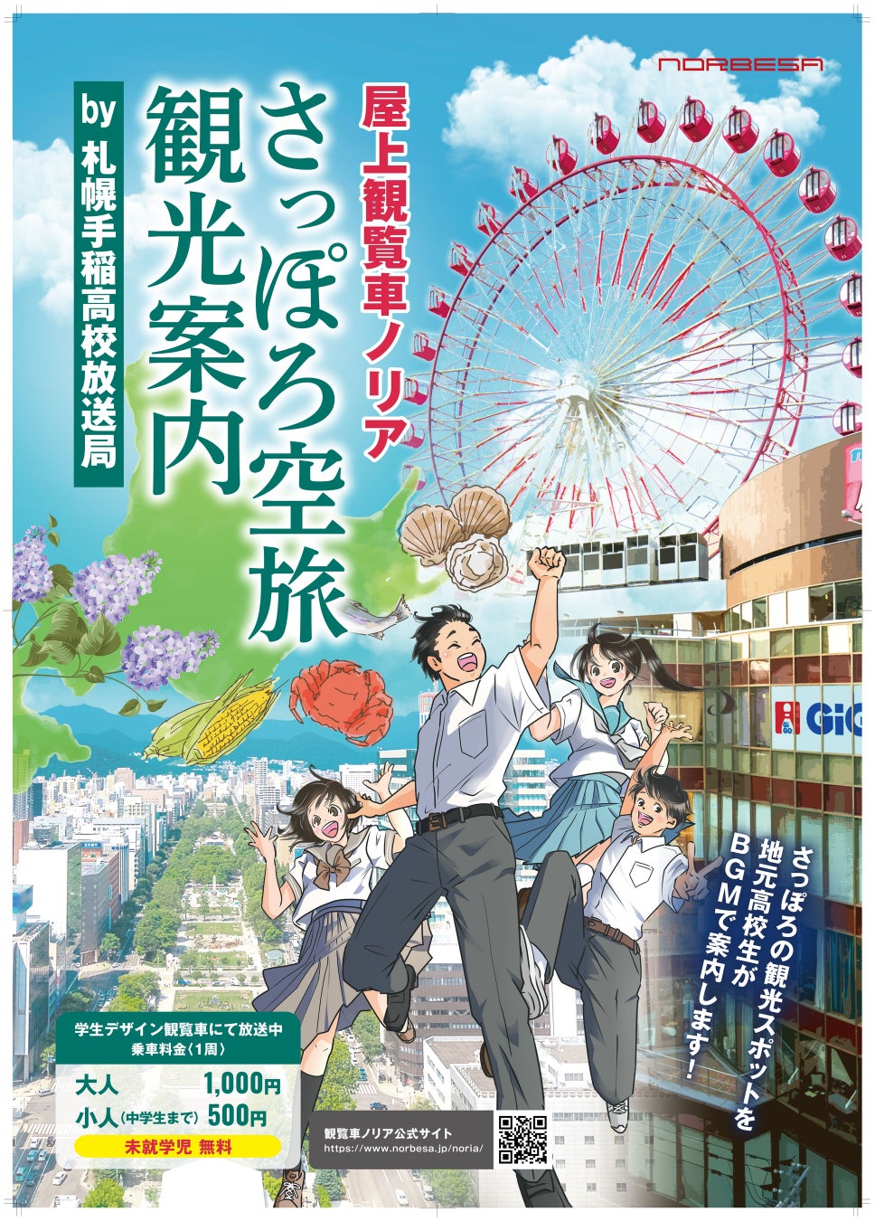 札幌の商業施設『ノルベサ(中央区南3西5)』の屋上観覧車「nORIA(ノリア)」では、札幌手稲高校放送局とコラボした観覧車内の札幌観光案内放送「さっぽろ空旅観光案内」がスタートいたします。