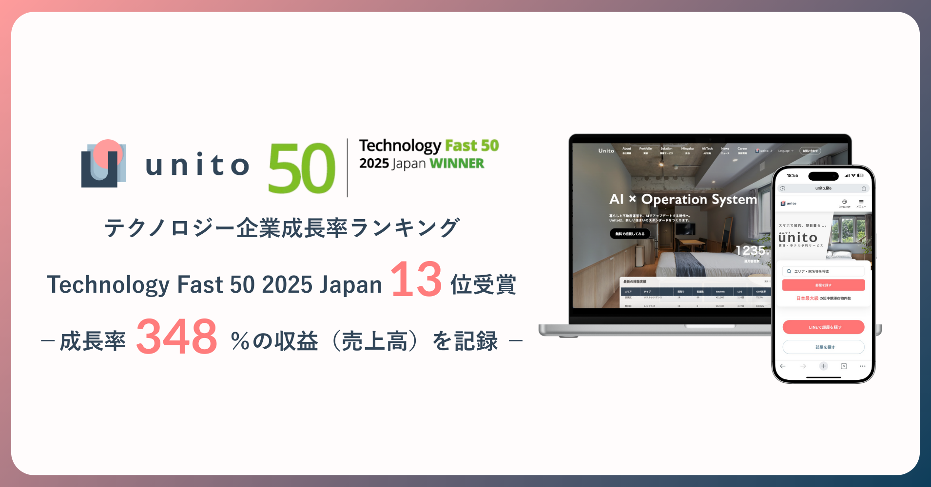 株式会社Unito(本社:東京都目黒区、代表取締役:近藤佑太朗、以下当社)は、デロイト トーマツ グループが2026年1月28日に発表したテクノロジー・メディア・通信(以下、TMT)業界の収益(売上高)に基づく成長率のランキング「Technology Fast 50 2025 Japan」において、過去3決算期の収益(売上高)に基づく成長率348%を記録し、50位中13位を受賞しました。昨年に引き続き2回目の受賞です。