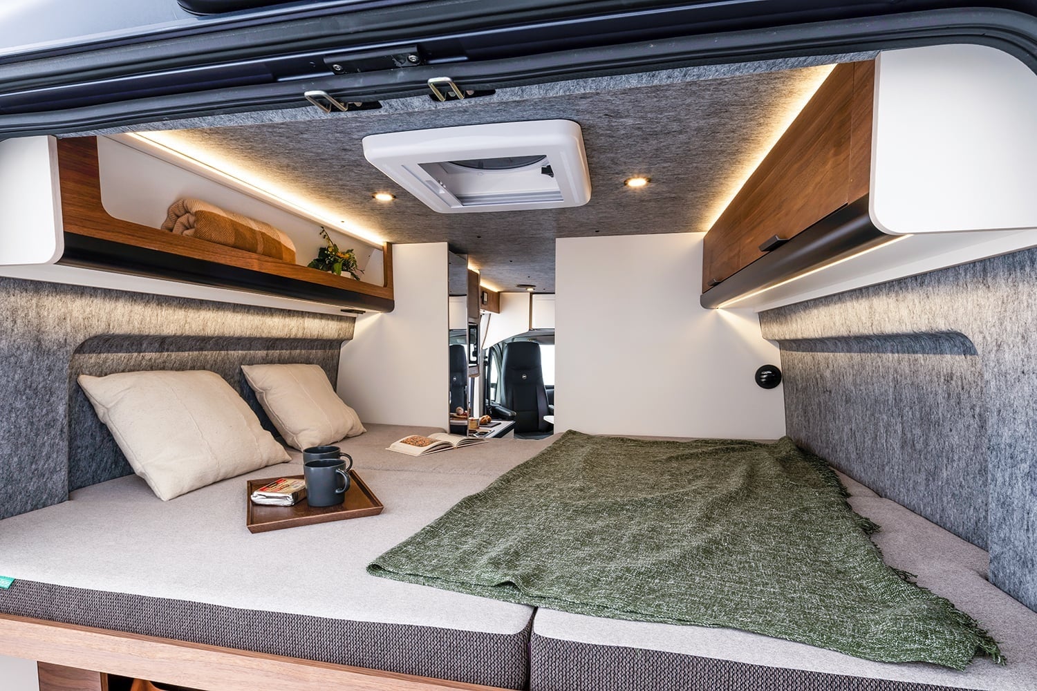 ベッド幅を20cm拡張し、大人2人がよりゆったりと寛げる常設リヤベッドとして進化しました。(サイズ : L1,940 × W1,470mm)