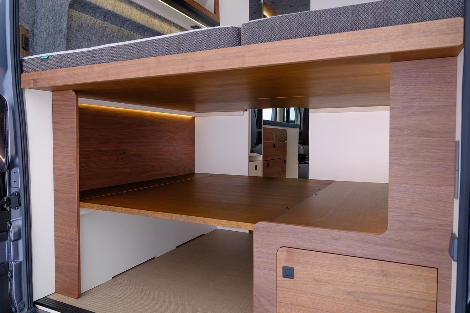 リヤベッド下のラゲッジスペースは、オプションで棚板の上にベッドマットの追加が可能。就寝人数を2名プラスできます。(下段ベッド:L1,770mm × W1,350mm)