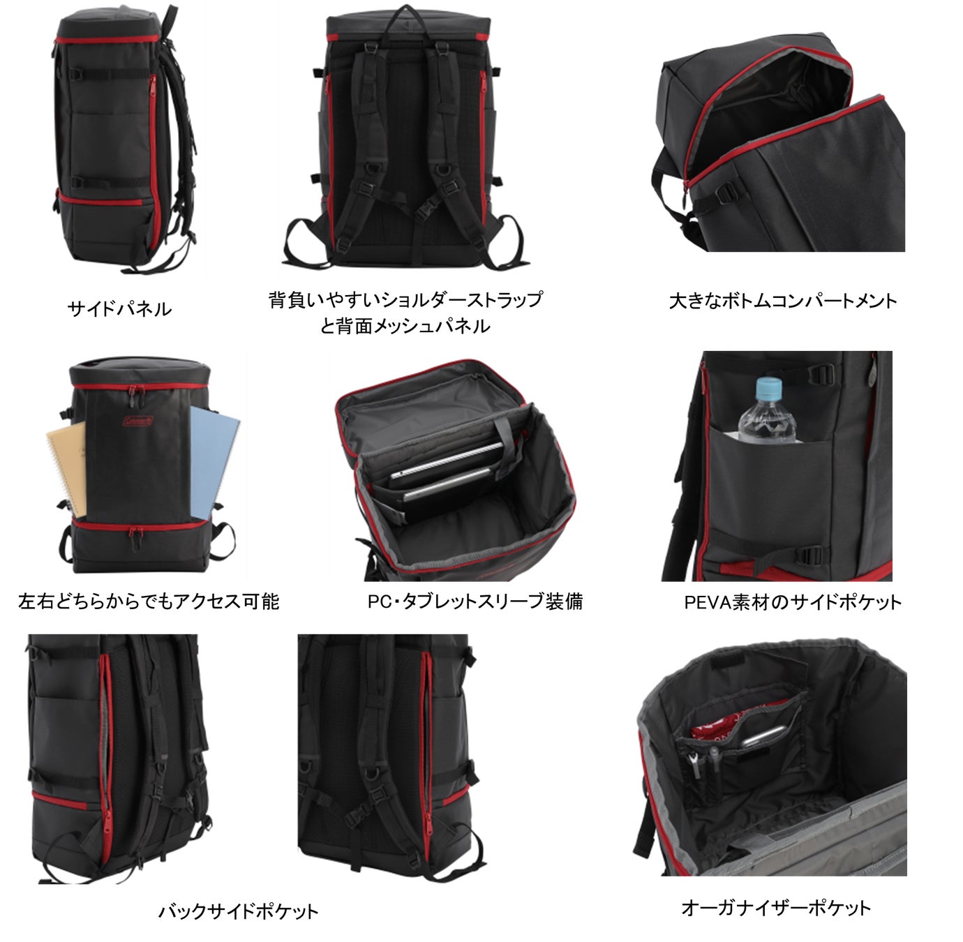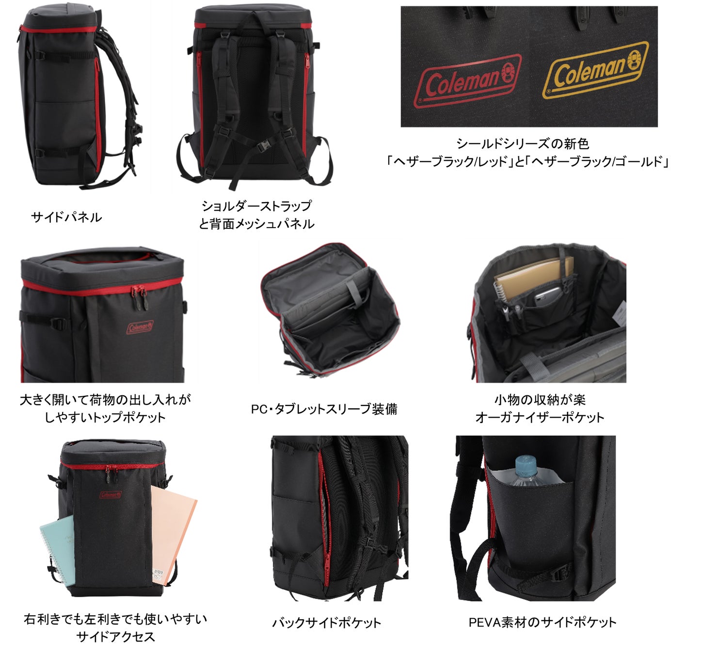 「シールド」シリーズは、水に強いタフな防水素材で通学や通勤、部活やジムにフィットするファッション性の高いスクエアタイプのバックパックです。メインコンパートメントは撥水ジッパーで、傘などの収納に便利なPEVA素材のサイドポケットも付いています。PCスリーブ付きで、収納力に優れた大容量バックパックなので、アウトドアや旅行はもちろん、通勤や通学、部活などでも大活躍します。