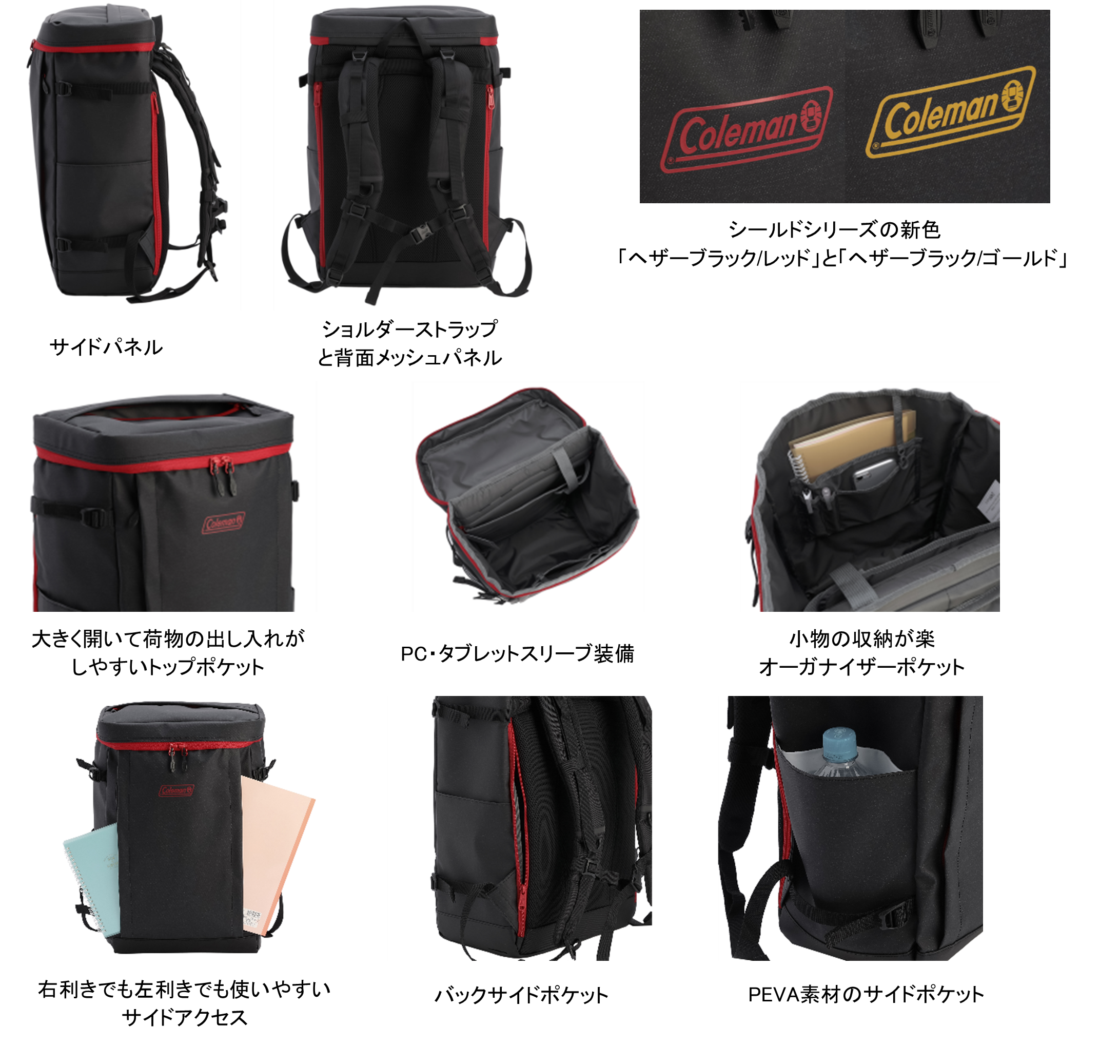 「シールド」シリーズは、水に強いタフな防水素材で通学や通勤、部活やジムにフィットするファッション性の高いスクエアタイプのバックパックです。メインコンパートメントは撥水ジッパーで、傘などの収納に便利なPEVA素材のサイドポケットも付いています。PCスリーブ付きで、収納力に優れた大容量バックパックなので、アウトドアや旅行はもちろん、通勤や通学、部活などでも大活躍します。