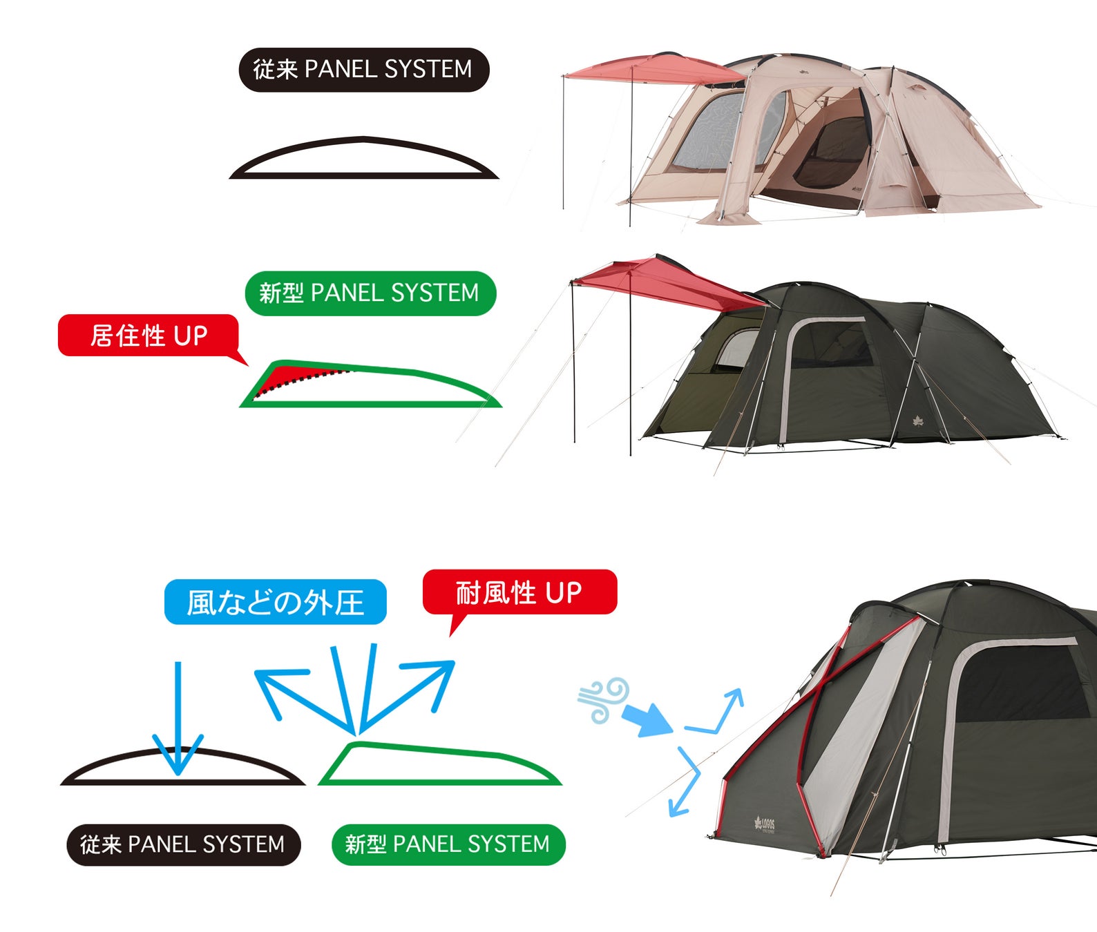 従来モデルからフレーム形状を見直した新型PANEL SYSTEM搭載により、居住性と耐風性が向上。新型PANEL SYSTEMは、クロス状に組み込んだテント前面のフレーム先端に角度を加えた構造。従来モデル同様、フレームの筋交い構造で優れた強度を保ちつつ、テント前面のフレーム先端に角度を加えることで、室内にゆとりが生まれるほか、風に強い安定した構造を実現。新型PANEL SYSTEMにより、頂点が入り口側に来る構造のため、天井の高い部分が拡張し、開放感溢れる居住空間に。