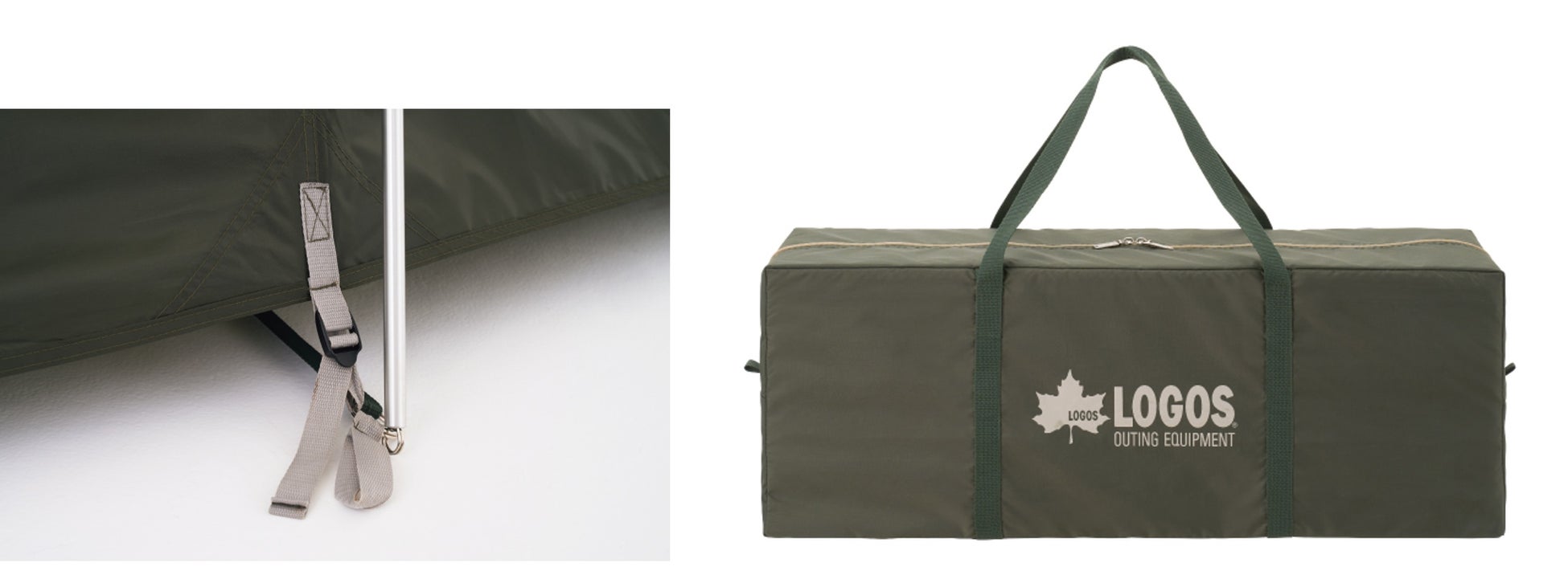 また、「SUPPORT BELT SYSTEM」の採用により、フレームをセットした後、緩めたベルトを短く締めるだけで簡単に設営が完了します。撤収時も、ベルトを緩めるだけで力の弱い方でも簡単に片付けが可能です。持ち運びに便利な収納バッグは、ジッパーが大きく開くので出し入れラクラクです。