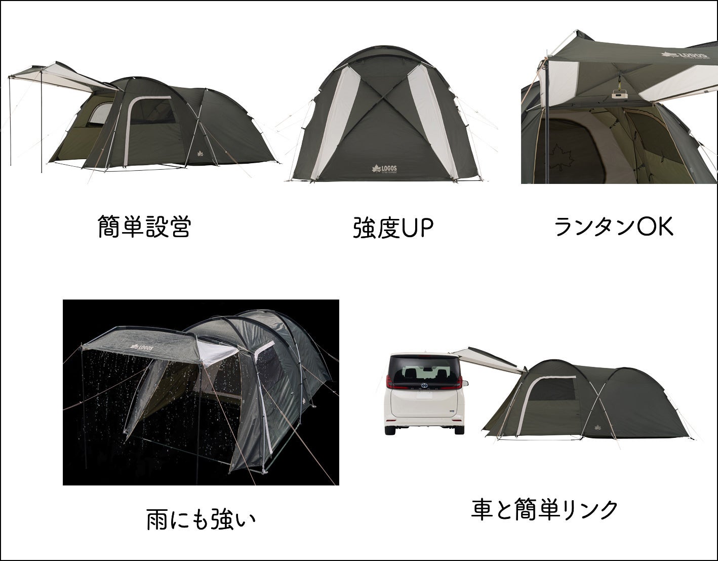 また、従来モデルからフレーム形状を見直した新型PANEL SYSTEM搭載により、居住性と耐風性が向上しました。新型PANEL SYSTEMは、クロス状に組み込んだテント前面のフレーム先端に角度を加えた構造です。従来モデル同様、フレームの筋交い構造で優れた強度を保ちつつ、フレーム先端に角度を加えることで、室内にゆとりが生まれるほか、風に強い安定した構造を実現しています。付属の2本のポールで支えるだけでテントと一体化したタープとなり、新型PANEL SYSTEM搭載で頂点が入り口側に来る構造のため、天井の高い部分が拡張し、開放感溢れる居住空間が楽しめます。そのほか、従来モデル同様、湾曲したキャノピーによる雨だまりの防止や業界初の機能となるクロス部分へのランタンの吊り下げも可能です。さらに、標準装備の車体連結用ジョイントを使用することで、テントと車がリンクでき、プライベート空間の拡張も簡単です。