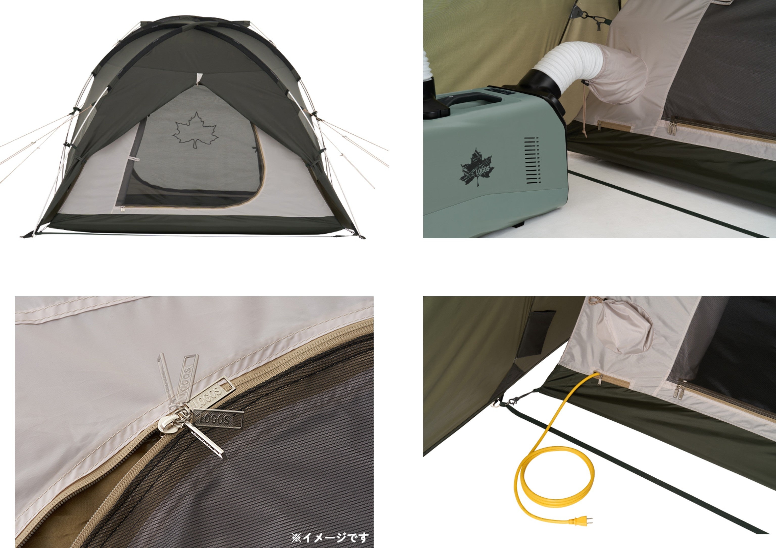 そのほか、インナーテントには、空気の循環を促すC型ドアや手を持ちかえることなく一気に開閉可能なLOGOS独自開発の「回転式ジッパー」、暑い季節でも快適に過ごせる、ポータブルタイプの「エレキャン・エアコン-BF」(別売り)などを設置できるエアコン用ダクト差し込み口、冷気の侵入を防ぐジッパー付きの電源コード取り込み口など、様々な機能を採用することで、快適なアウトドア空間を楽しめます。