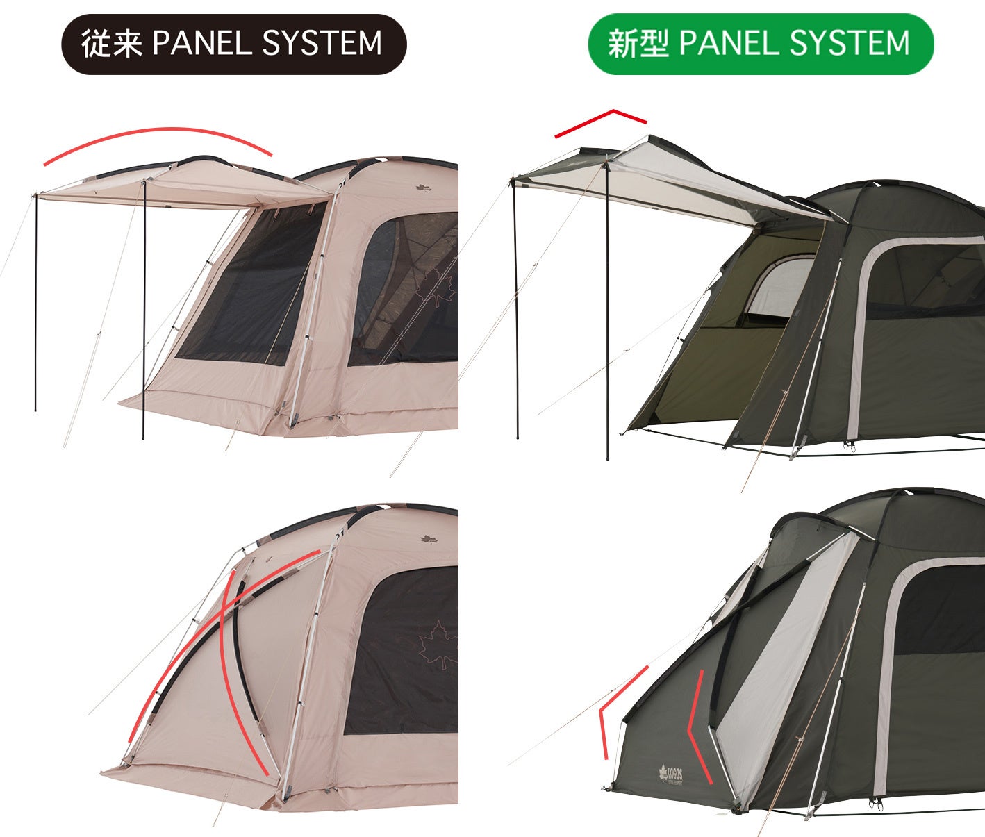 従来モデルからフレーム形状を見直した新型PANEL SYSTEM搭載により、居住性と耐風性が向上。新型PANEL SYSTEMは、クロス状に組み込んだテント前面のフレーム先端に角度を加えた構造。従来モデル同様、フレームの筋交い構造で優れた強度を保ちつつ、テント前面のフレーム先端に角度を加えることで、室内にゆとりが生まれるほか、風に強い安定した構造を実現。新型PANEL SYSTEMにより、頂点が入り口側に来る構造のため、天井の高い部分が拡張し、開放感溢れる居住空間に。