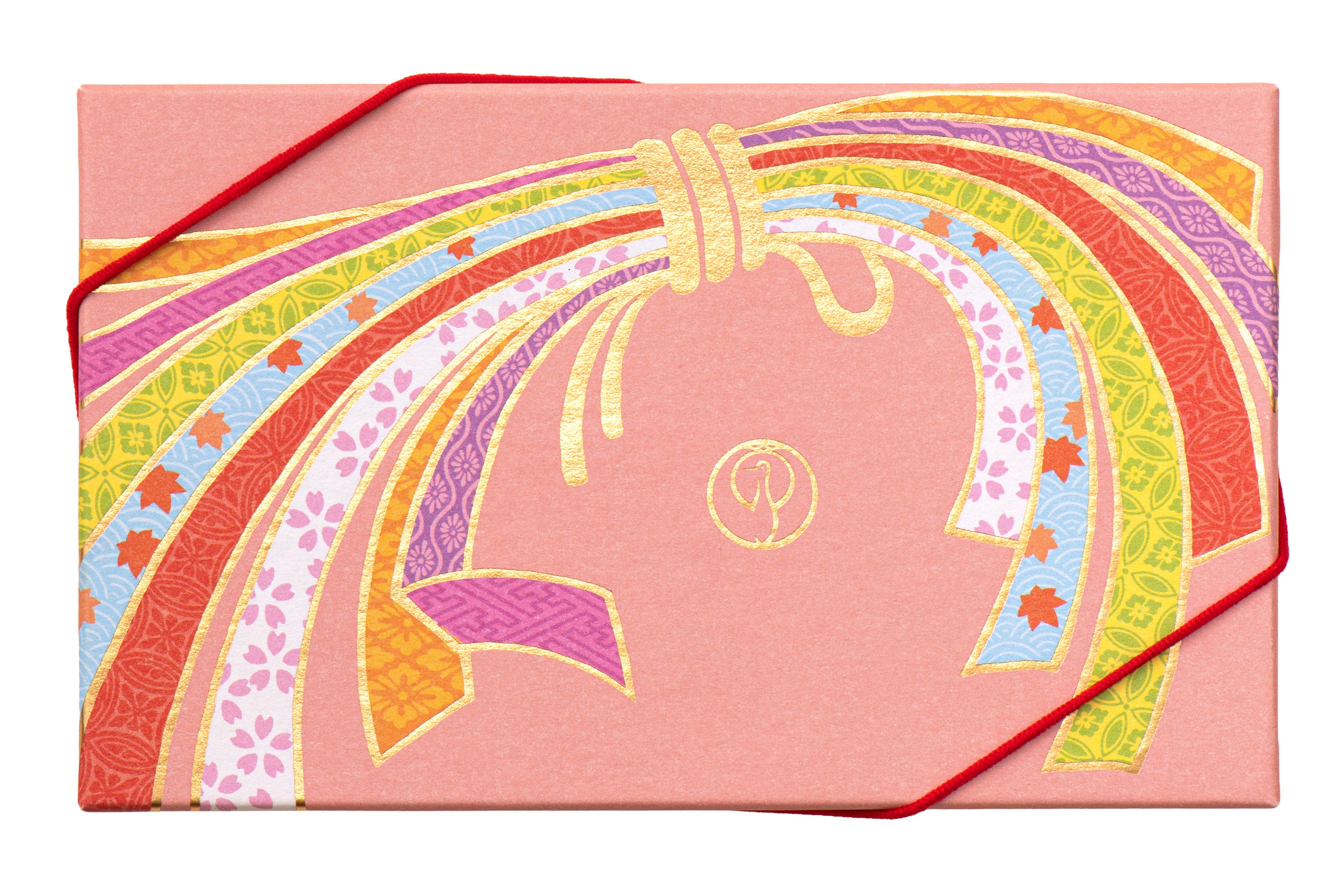 あたたかく落ち着いた桃色は、日本の伝統色「朱鷺色(ときいろ)」から。伝統工芸・京友禅をイメージし、着物の柄に古くから愛されてきた吉祥文様である「束ね熨斗(たばねのし)」をあしらいました。それぞれの熨斗には和の伝統文様、桜・紅葉の春秋模様を細かく描き、金の箔押しで上品に仕上げています。