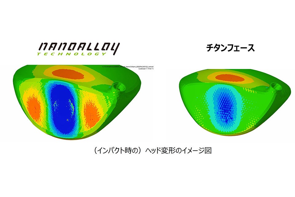 「JPX ONE」シリーズのドライバーには、世界で初めて『NANOALLOY®』を応用し、ゴルフクラブヘッド用に開発した『NANOALLOY®フェース』を搭載しています。チタンフェースの上に搭載した厚さ0.4mmの『NANOALLOY®フェース』は、チタンフェースがインパクト時に局所的に変形するのに対し、その素材特性によってフェース全体が大きくたわみます。フェース側が変形することでゴルフボール側の変形が抑えられ、その結果エネルギーロスが小さくなることで、ミズノ史上最高のボール初速※3を実現しました。