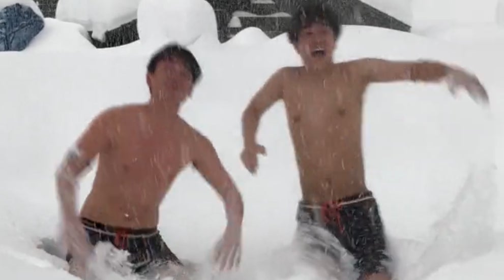 写真は、東京から来た男性お二人が「背面」雪ダイブを行うところ。この日は、北海道が記録的な大雪に見舞われた日。これまでにないパウダースノーの山ができていました。