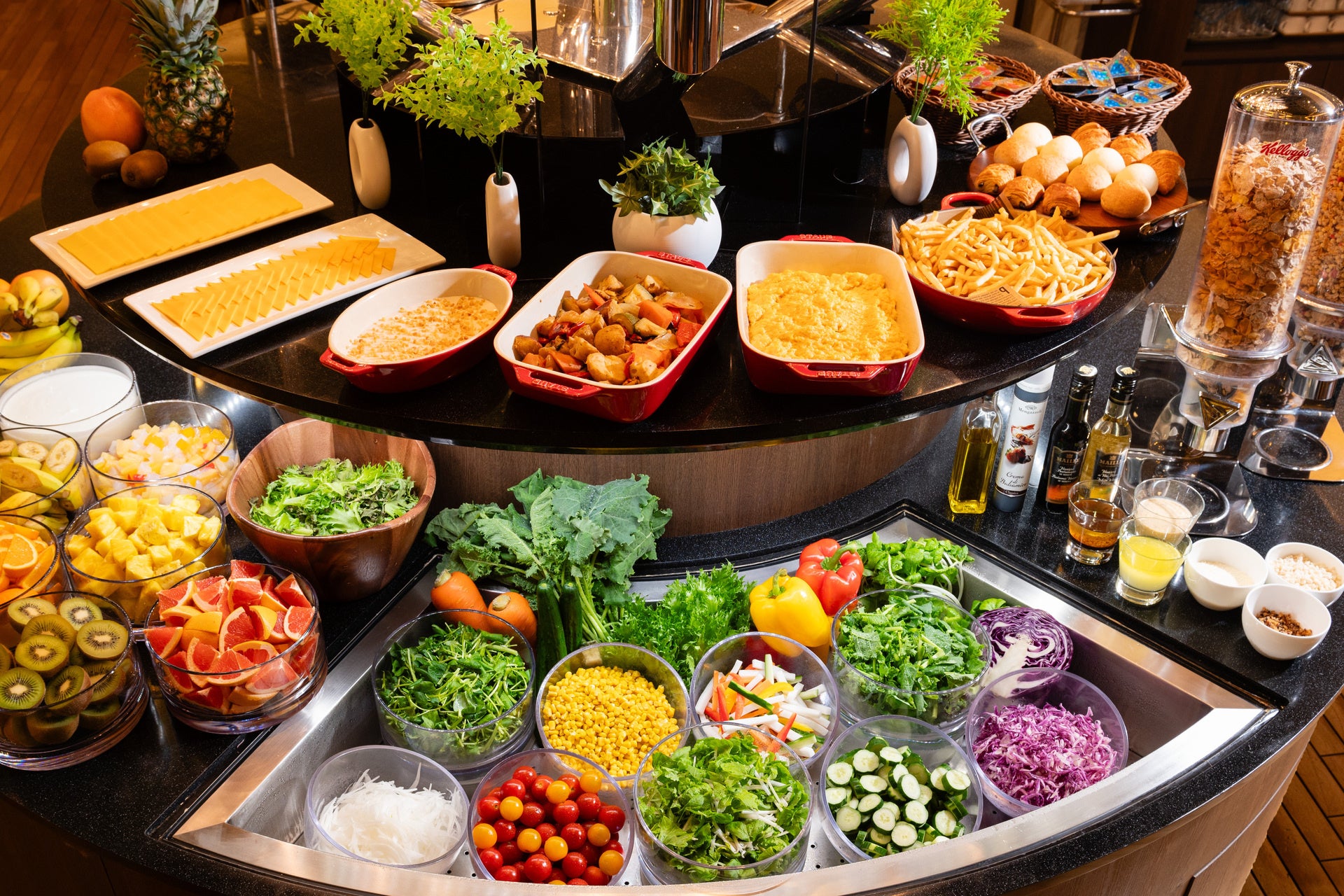 シェフが目の前で切り分ける黒毛和牛の「自家製ローストビーフ」や「すき煮」、「鮑と茸のソテー」など、豪華な食材を使用したメニューを多数ご用意。大阪企業の名品を使用したオリジナルメニューなど、当ホテルでしか味わえないお料理もございます。スパークリングワインのフリーフローの他豊富なドリンクもご用意し、非日常を味わえる朝食をご堪能いただけます。