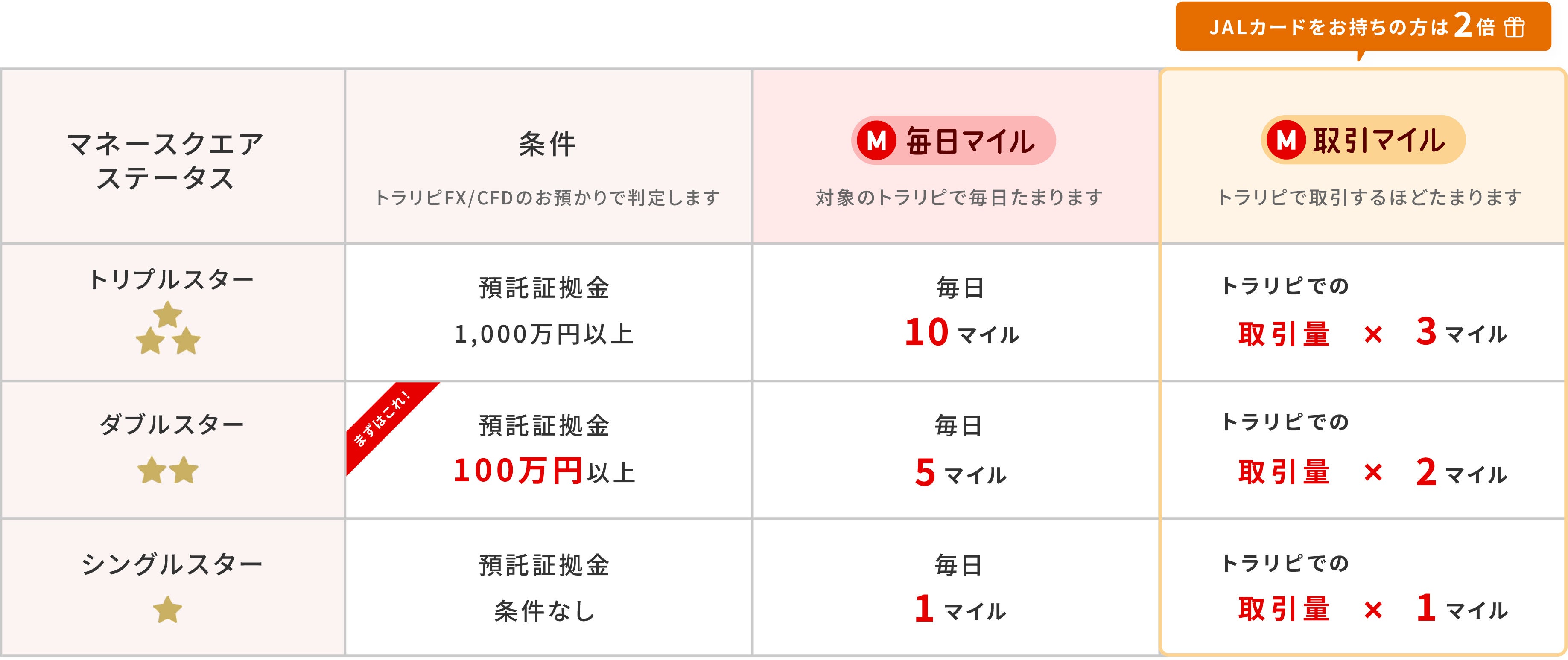 マネースクエアステータス(トラリピFX/CFDの合計預託証拠金で決定)に応じ以下のマイルが積算されます。