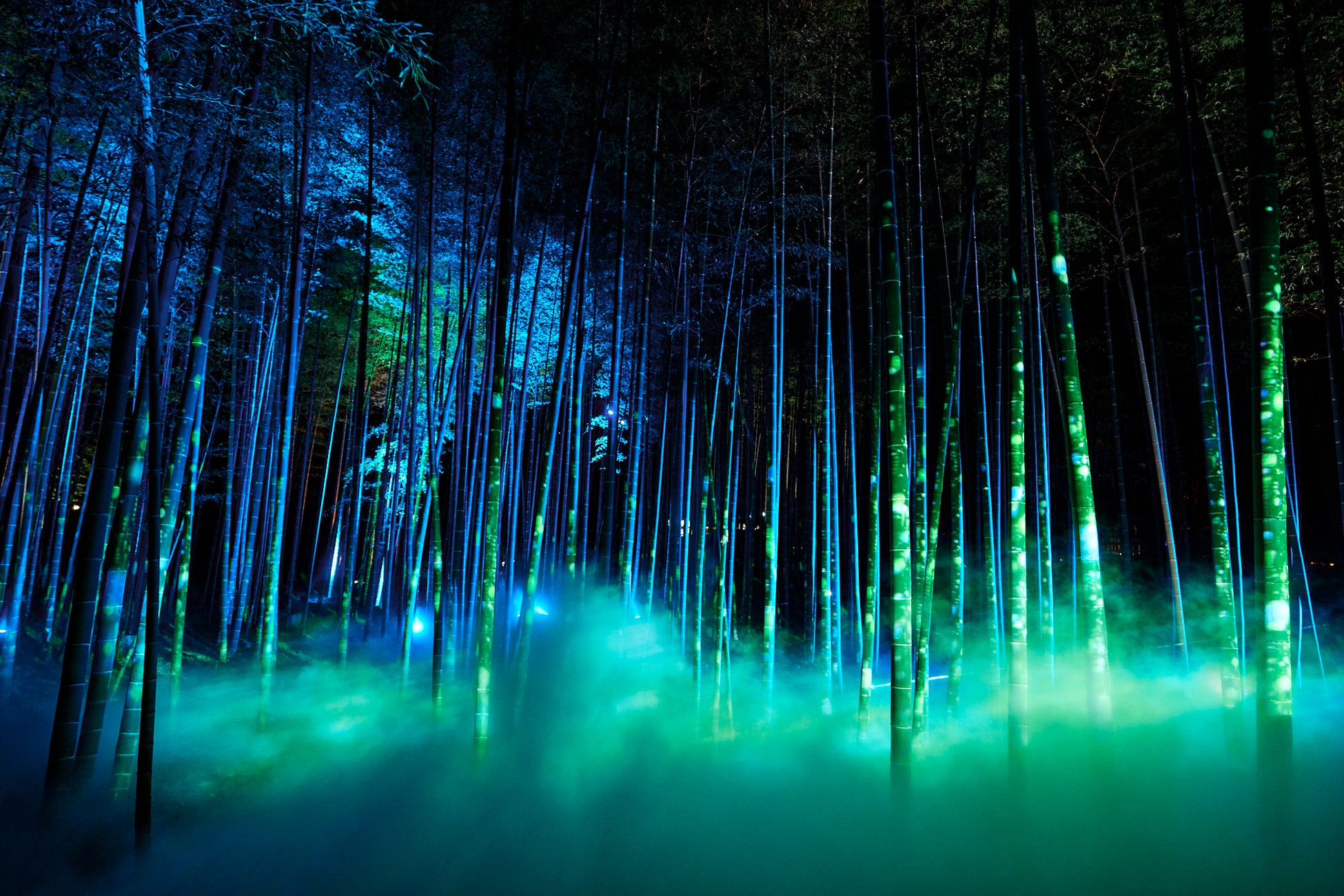平安時代末期から続く旧公家・山科家の末裔であり、宮廷装束の調進・着装を伝承する「衣紋道山科流」の若宗家。本イベントでは、平安時代から受け継がれてきた 「日本の伝統色」の中から、夜の梅林に美しく映える色彩を選定・監修。「重ね色目」の思想を光に置き換え描き出しています。 また、竹林の霧に浮かび上がる和歌の文字は、本企画のために山科言親氏ご本人が筆を執り、書き下ろしたものです。