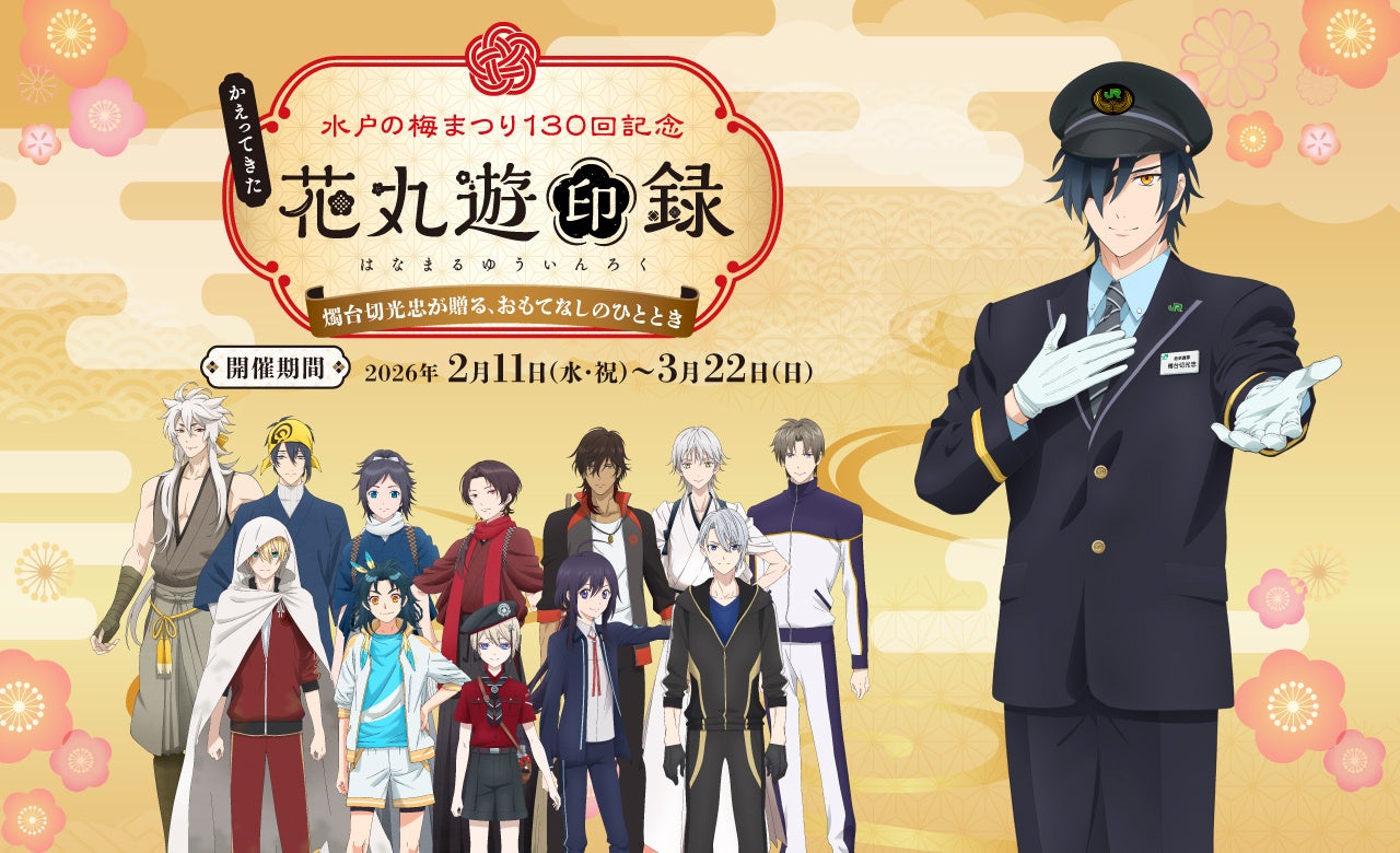 JR 東日本水戸支社では、水戸の梅まつり130回を記念し、放映10周年を迎えるアニメ 『刀剣乱舞-花丸-』とのタイアップ企画「かえってきた 花丸遊印録~燭台切光忠が贈る、おもてなしのひととき~」を開催。 「偕楽園 UME The Lights 2026」の一部エリアでの『刀剣乱舞-花丸-』特別演出に加え、スタンプラリーやコラボカフェ、オリジナルグッズの販売や駅デコレーションなどを実施します。