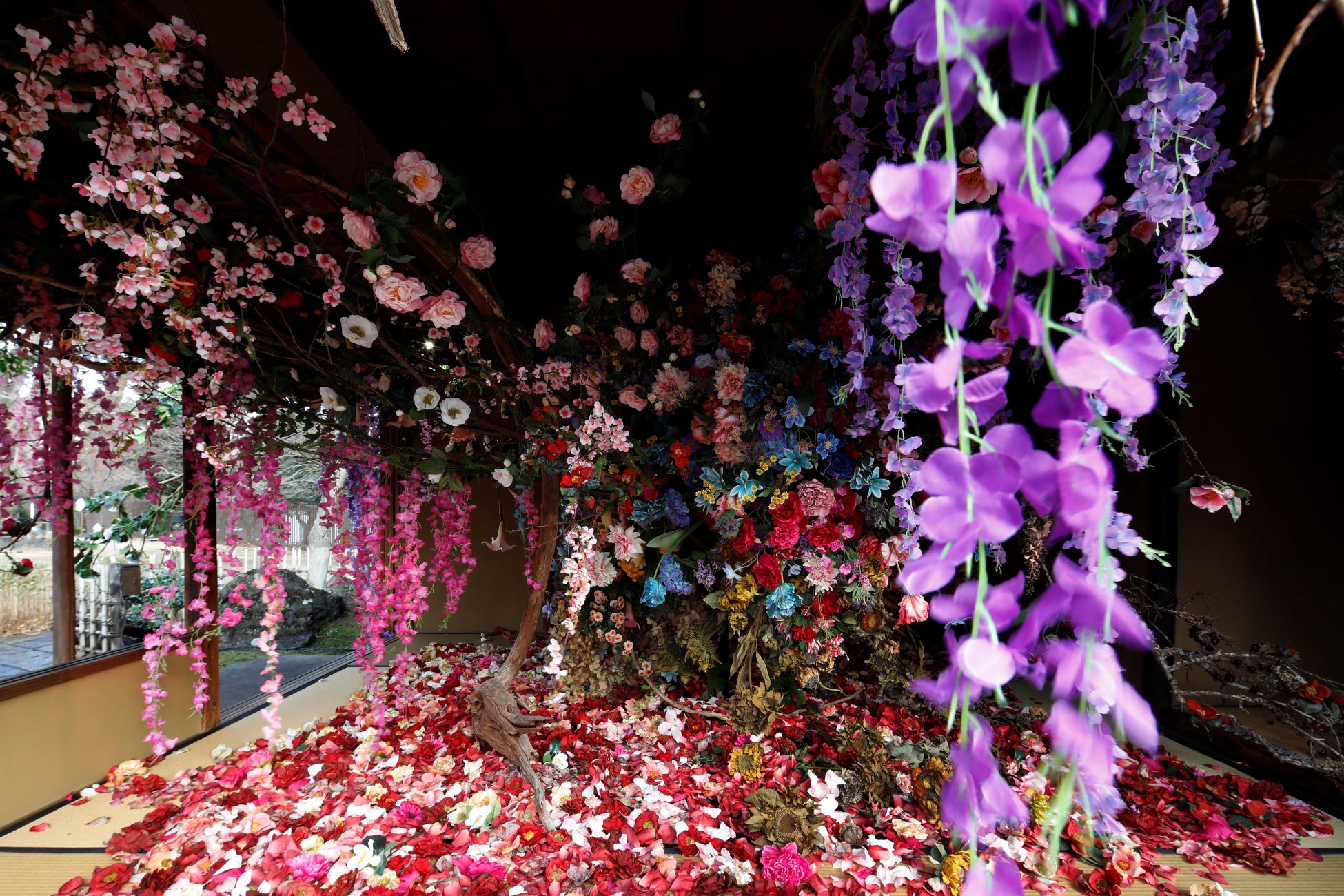 さらに《残照》について蜷川は、「今回の《残照》はあえて枯れた状態を再現した花と、咲き誇る花を対比させたインスタレーションで、シリーズの中でも、ひとつの到達点になったと手応えを感じている作品です。咲き誇りながら枯れて落ちていく光景は、生と死、あるいは時間の経過を表現している。枯れることや朽ちることは決してネガティブなことではなく、それは花も人も同じ。その中にある圧倒的な美しさに注目していただきたい。」と述べました。
