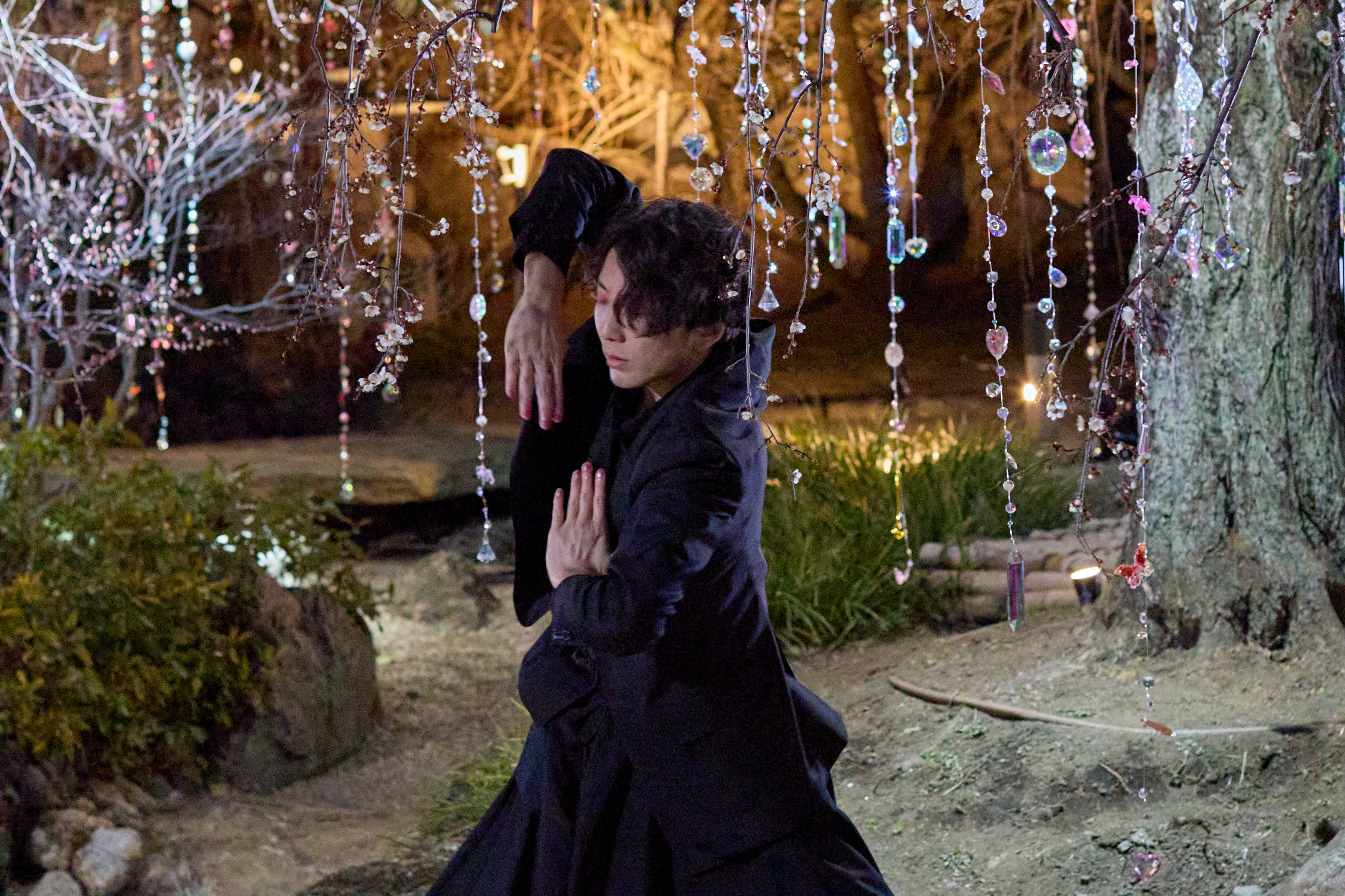 記者発表会の最後には、アートインスタレーションの会場となる梅苑にて、ダンスカンパニーDAZZLE主宰 長谷川達也による一夜限りの「奉納の舞」が披露されました。