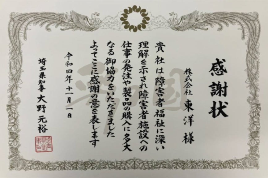 2021年4月1日から行田店にて、福祉施設支援のクレーンゲーム「毎日焼きたてパンキャッチャー」を展開している株式会社東洋ですが、継続的な取り組みや実績が評価され、令和4年11月1日に「障害者就労施設応援企業」に認定され、感謝状を授与頂きました。