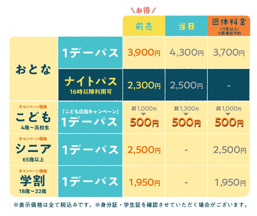 ■販売価格:こども(4歳~高校生)1デーパス500円(税込)
