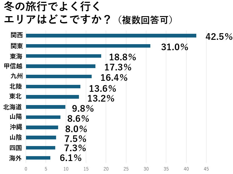 「冬の旅行でよく行くエリアは?」という質問をしたところ、関西エリアが1位となり、次いで関東、東海、甲信越、九州と続きました。具体的には、「冬の特別拝観のために京都へ」、「永平寺へ雪景色を見に」、「カニを目的に福井県三国へ」、「東海岸、南伊豆、修善寺など伊豆半島の温泉地」、「奥日光などのバードウォッチングができるところ」といったコメントが挙がっていました。(n=590)