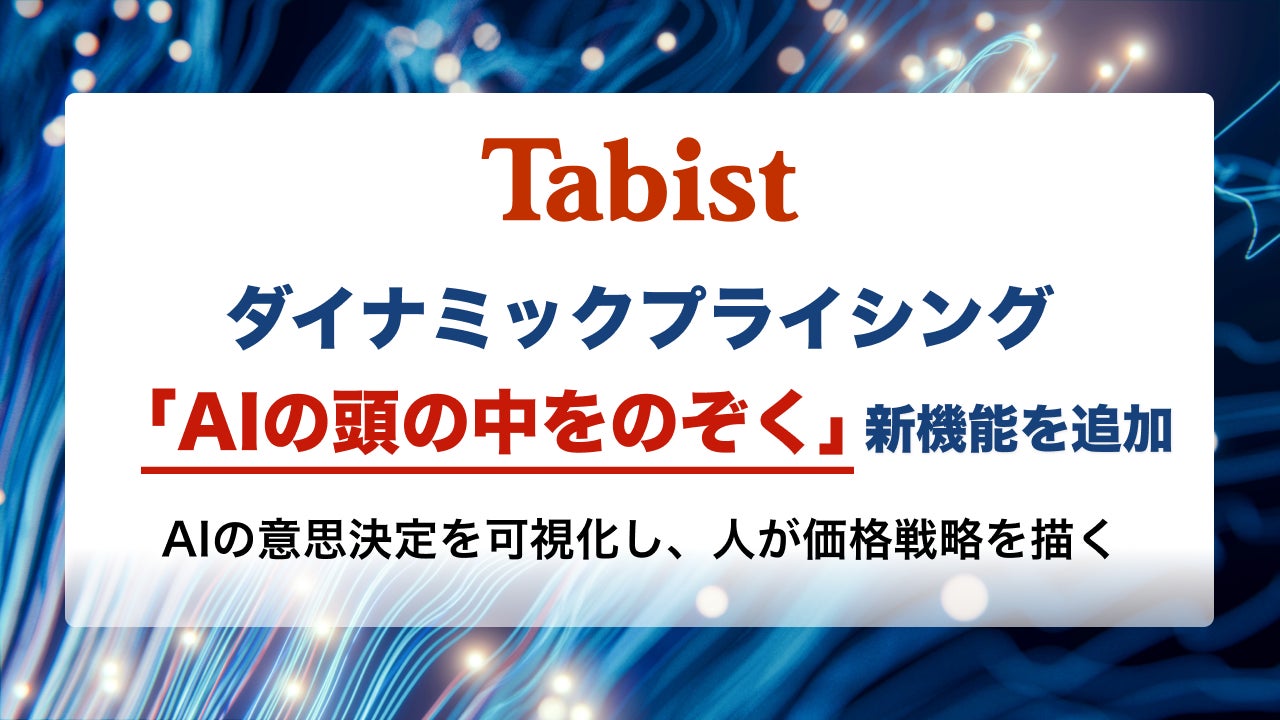 宿泊・観光産業のDX(デジタルトランスフォーメーション)を推進するTabist株式会社(本社:東京都港区、代表取締役社長 兼 CEO:田野崎亮太、以下「Tabist」)は、宿泊施設向けに提供している「ダイナミックプライシング」をコントロールする価格ダッシュボードに、新機能「AIの頭の中をのぞく」を追加しました。また、「Tabist BI(データ分析可視化ツール)」において、AI(人工知能)による売上予測(フォーキャスト)を可視化する機能の提供を併せて開始しました。