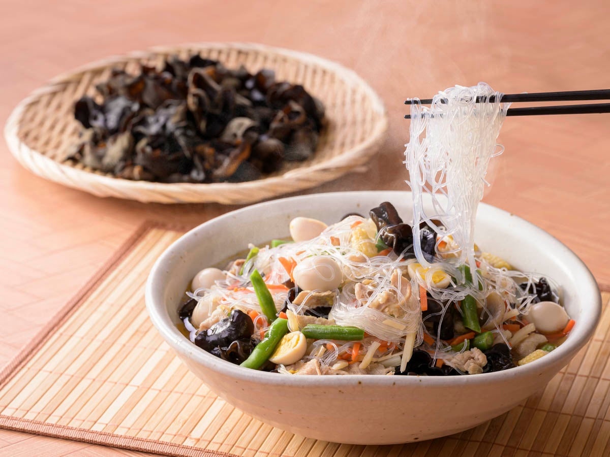 (右)鶏ガラスープに春雨や野菜、地元産のきくらげの旨みが溶け込んだ、体にやさしく温まる熊本の中華料理店や家庭でも定番な”熊本の郷土料理 太平燕”【熊本新市街限定】