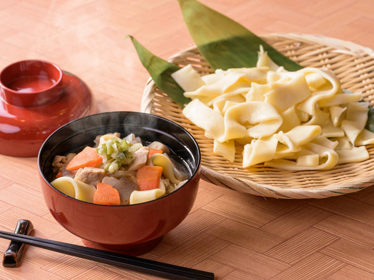 (左)小麦の名産地である群馬のおっきりこみを使用した、野菜のやさしいうまみが重なり合う”群馬の郷土料理 おっきりこみ”【前橋限定】