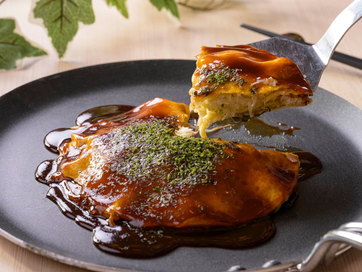 (左)地産ソースの濃厚な旨みが、香ばしい麺とキャベツの甘みと重なり合う食べ応えある”地産ソースで食べる広島風お好み焼き”【呉限定】