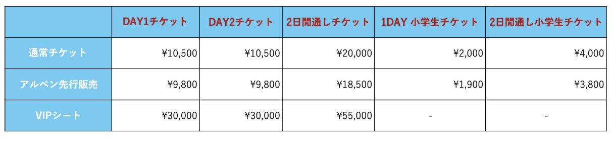 中学生以上:10,500円/2日間通し券20,000円