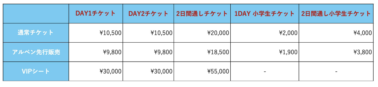 中学生以上:10,500円/2日間通し券20,000円