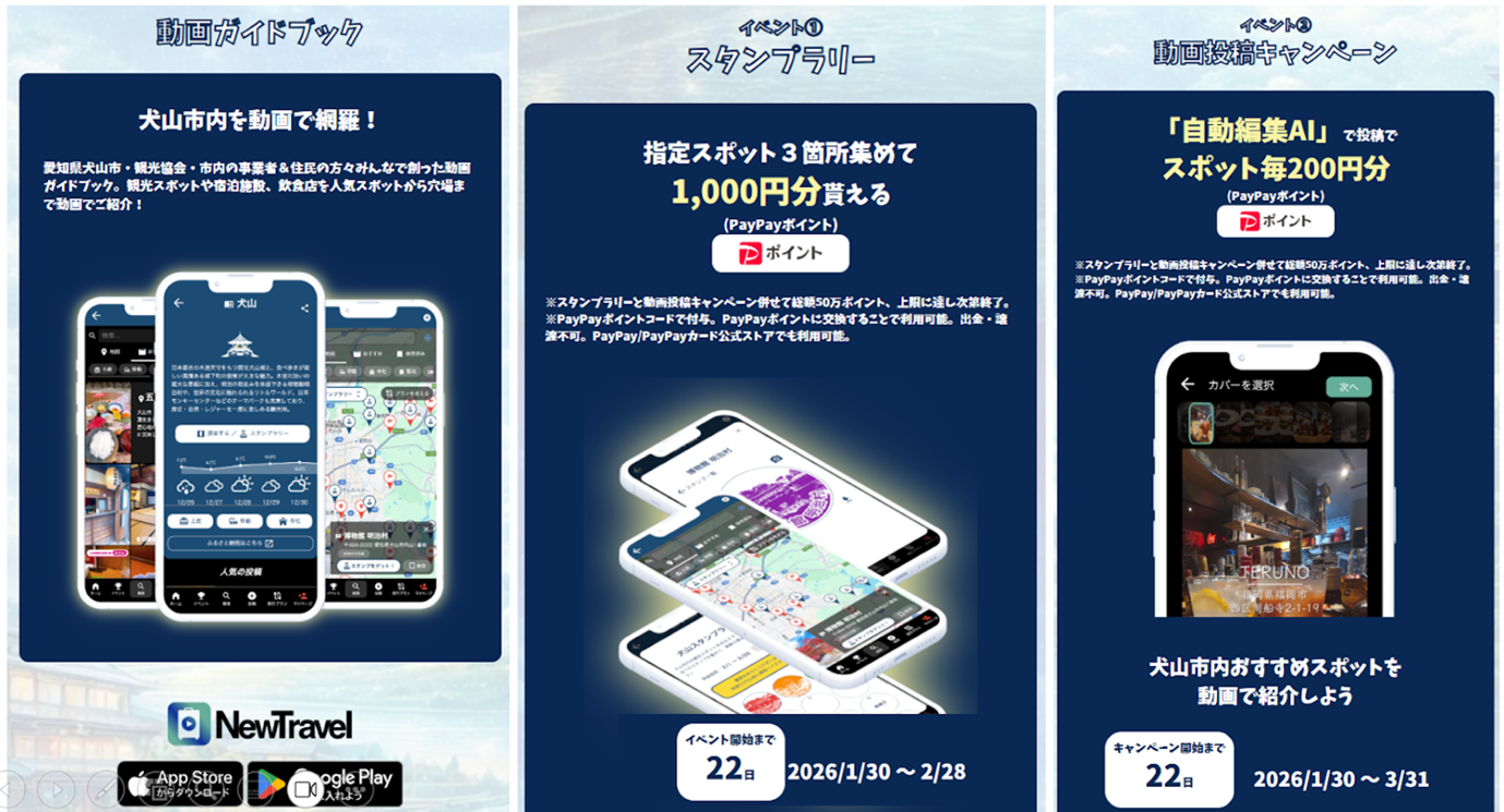 「NewTravel」が提供する「みんなで創る動画ガイドブック」および「動画自動編集AI」を活用して、犬山市全体を丸ごと動画ガイドブックとして映像で発信します。また、NewTravelの「デジタルスタンプラリー」や「旅行プラン自動生成AI」などの機能を用いて、市内の回遊性を高めるとともに、宿泊促進やオーバーツーリズム課題の解消に取り組みます。