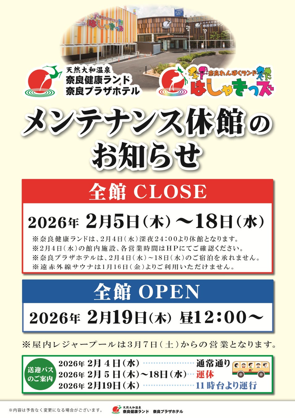 奈良健康ランド・奈良プラザホテル・奈良わんぱくランドはしゃきっズは、メンテナンスのため、全館休館を行います。