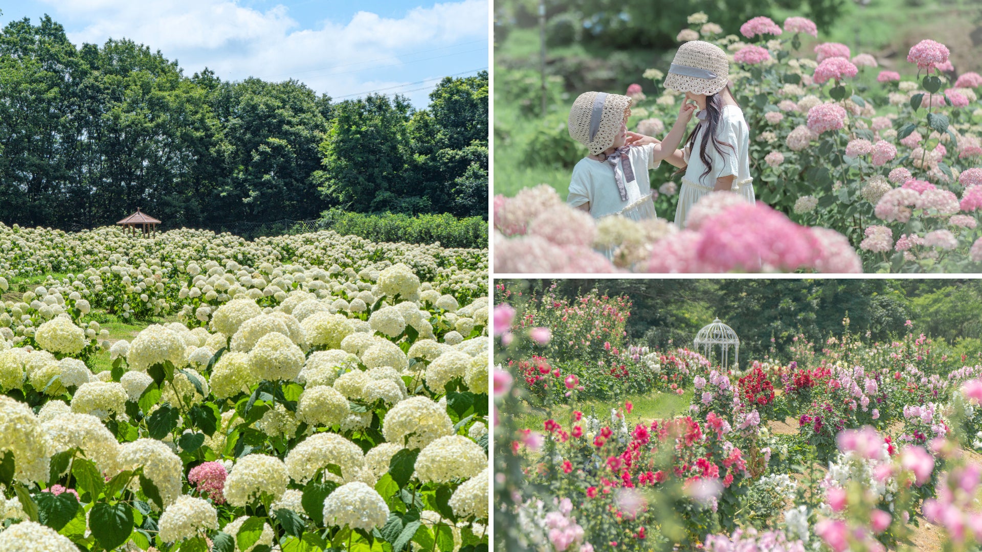 あじさいとタチアオイが同時に楽しめる丘。様々な種類のあじさいとタチアオイが高原を色づけます。