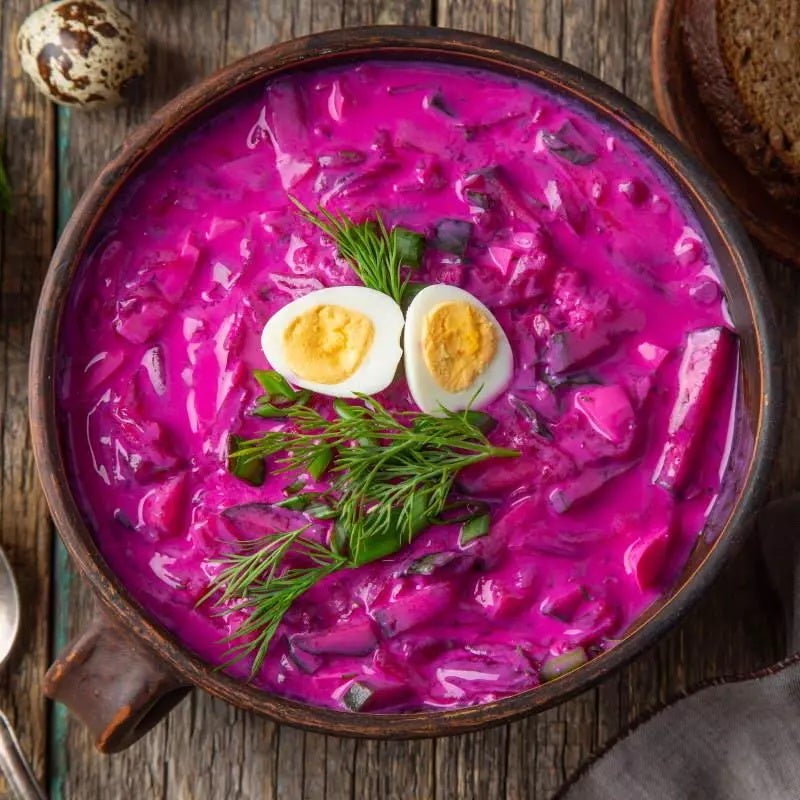 ラトビア人にとって夏の始まりを象徴する料理といえば、ビーツの冷製スープ。ビーツをベースに、ケフィアや発酵乳、バターミルクなどの乳製品を使用し、ゆでたジャガイモや卵、キュウリ、ディルやネギといった季節のハーブを加えて作られます。各家庭に独自のレシピがあり、味付けについて語り合うのも、この料理の楽しみのひとつです。