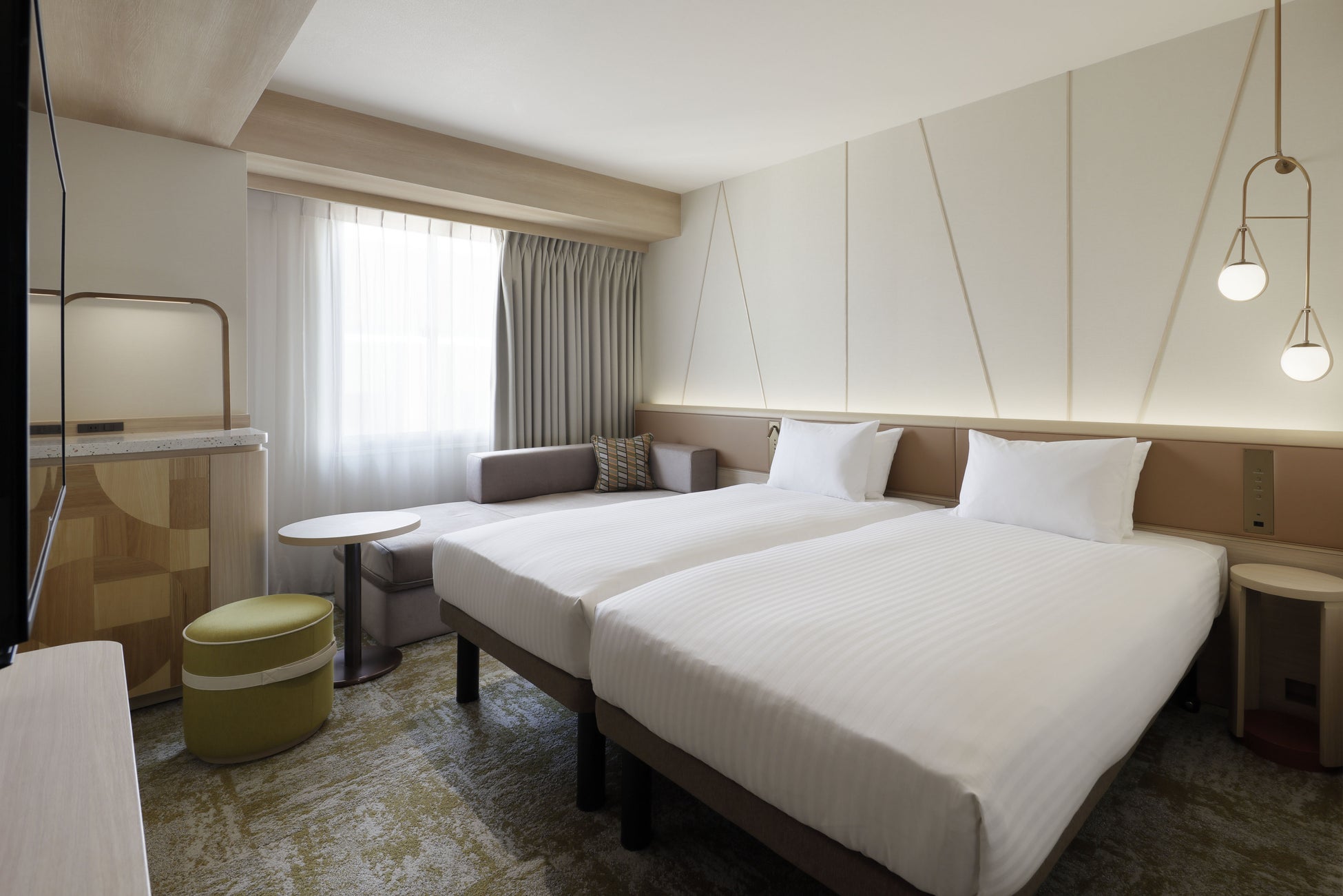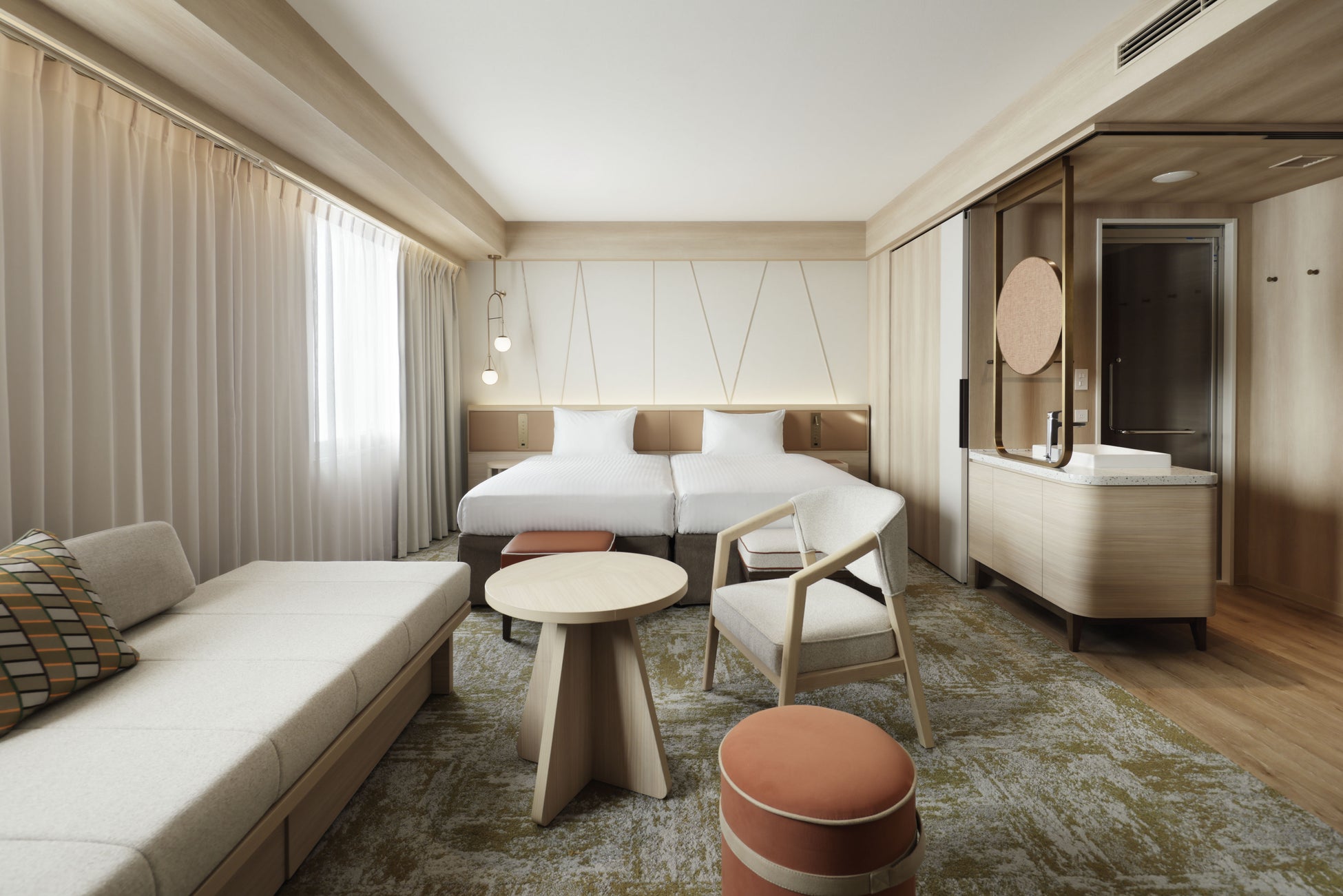 グループやファミリーでの利用の増加等、お客様のニーズの多様化に対応するため、客室は全7タイプ・177室へと刷新。既存の2室を1室に再構成し、3~4名でご宿泊いただける客室も20室から140室へ大幅に増設いたしました。内装や家具、備品も一新し、客室は落ち着いたデザインでまとめ、札幌の自然をイメージしたデザインをアクセントとしてミニバーに取り入れています。客室サインには、北海道の伝統的な手法で作った工芸品である優佳良織(ゆうからおり)を用いました。さらに、全客室の水回り設備も一新し、より快適で清潔感のある滞在をお楽しみいただけます。