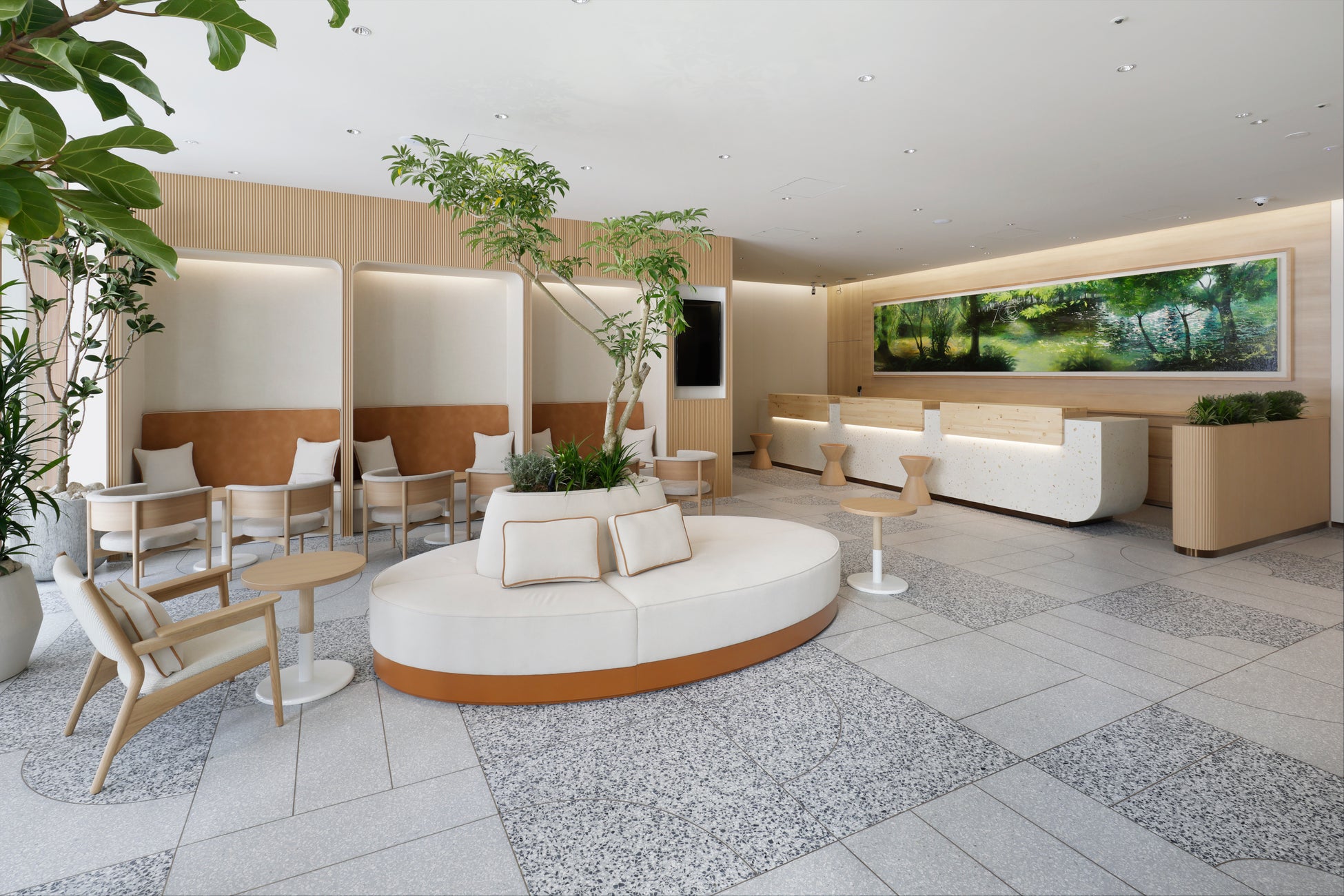 エントランスには美瑛町所在の「青い池」、ロビーには赤レンガ庁舎の庭や池をモチーフにした迫力のあるアートを配置するなど、北海道や札幌のローカリティを感じられる空間へと全面刷新いたしました。また、ロビーラウンジの内装・家具を一新し、植栽と調和した空間を創出しています。ゲストとホテルの最初の接点であるレセプションカウンターの天板には三井不動産グループ保有林の間伐材を利用し、木のぬくもりとともにゲストを温かくお迎えします。