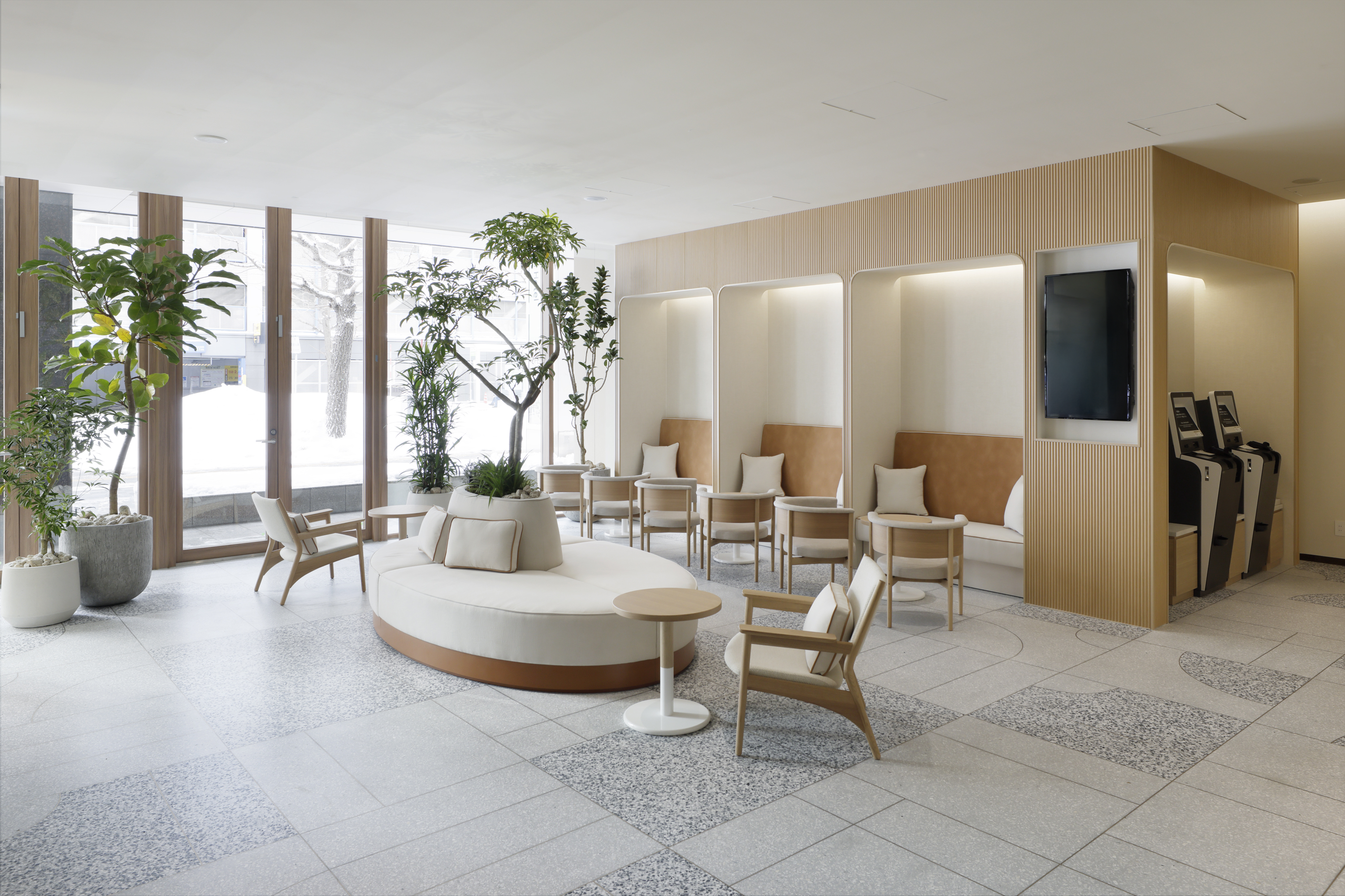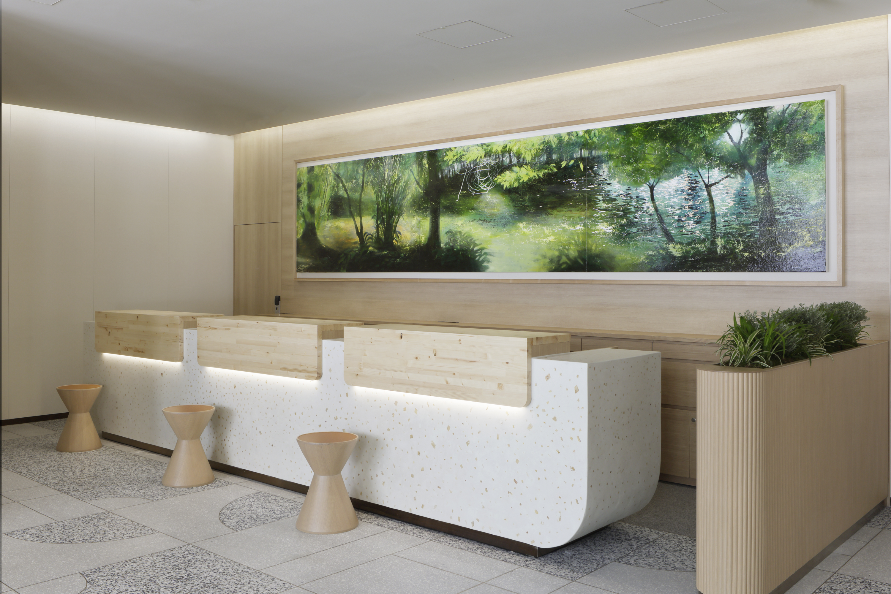 エントランスには美瑛町所在の「青い池」、ロビーには赤レンガ庁舎の庭や池をモチーフにした迫力のあるアートを配置するなど、北海道や札幌のローカリティを感じられる空間へと全面刷新いたしました。また、ロビーラウンジの内装・家具を一新し、植栽と調和した空間を創出しています。ゲストとホテルの最初の接点であるレセプションカウンターの天板には三井不動産グループ保有林の間伐材を利用し、木のぬくもりとともにゲストを温かくお迎えします。