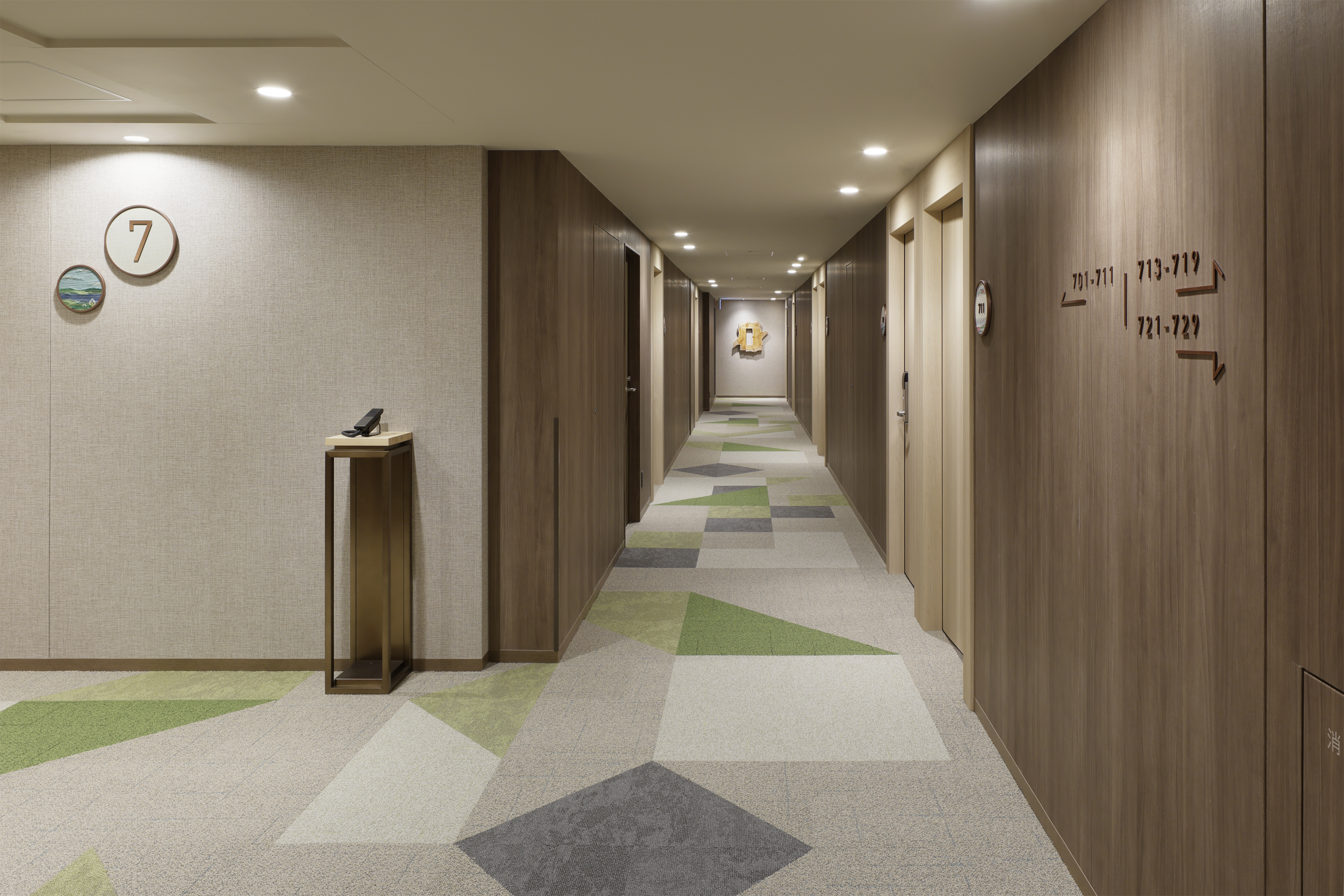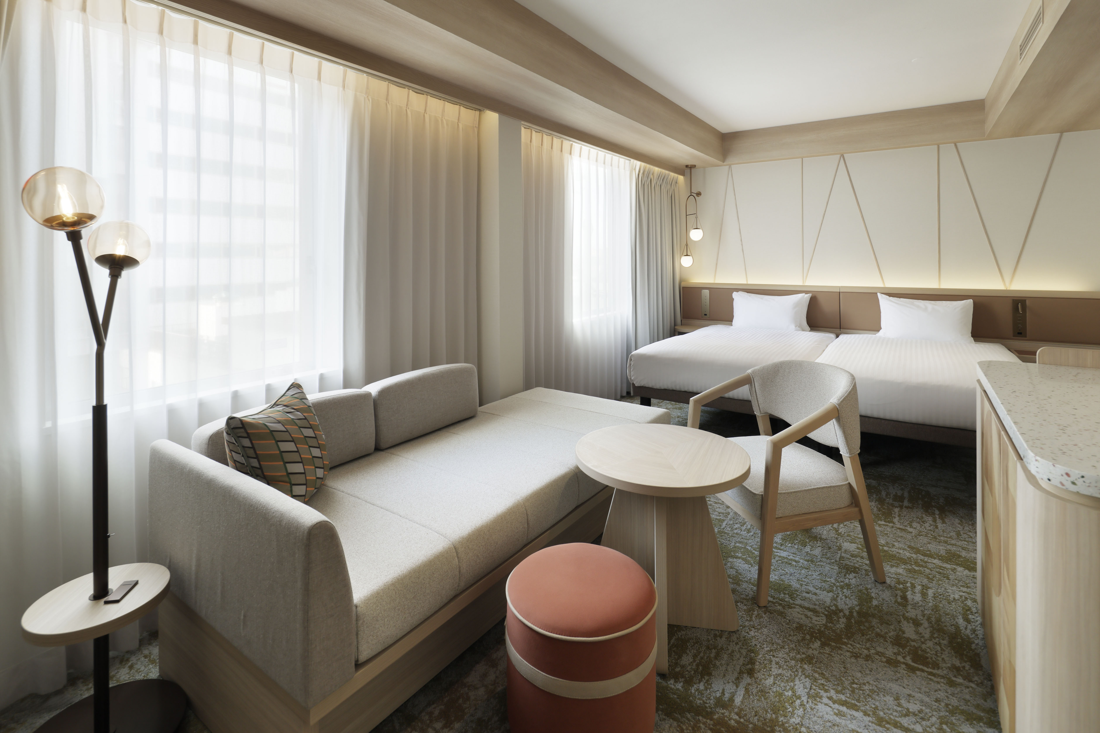 グループやファミリーでの利用の増加等、お客様のニーズの多様化に対応するため、客室は全7タイプ・177室へと刷新。既存の2室を1室に再構成し、3~4名でご宿泊いただける客室も20室から140室へ大幅に増設いたしました。内装や家具、備品も一新し、客室は落ち着いたデザインでまとめ、札幌の自然をイメージしたデザインをアクセントとしてミニバーに取り入れています。客室サインには、北海道の伝統的な手法で作った工芸品である優佳良織(ゆうからおり)を用いました。さらに、全客室の水回り設備も一新し、より快適で清潔感のある滞在をお楽しみいただけます。