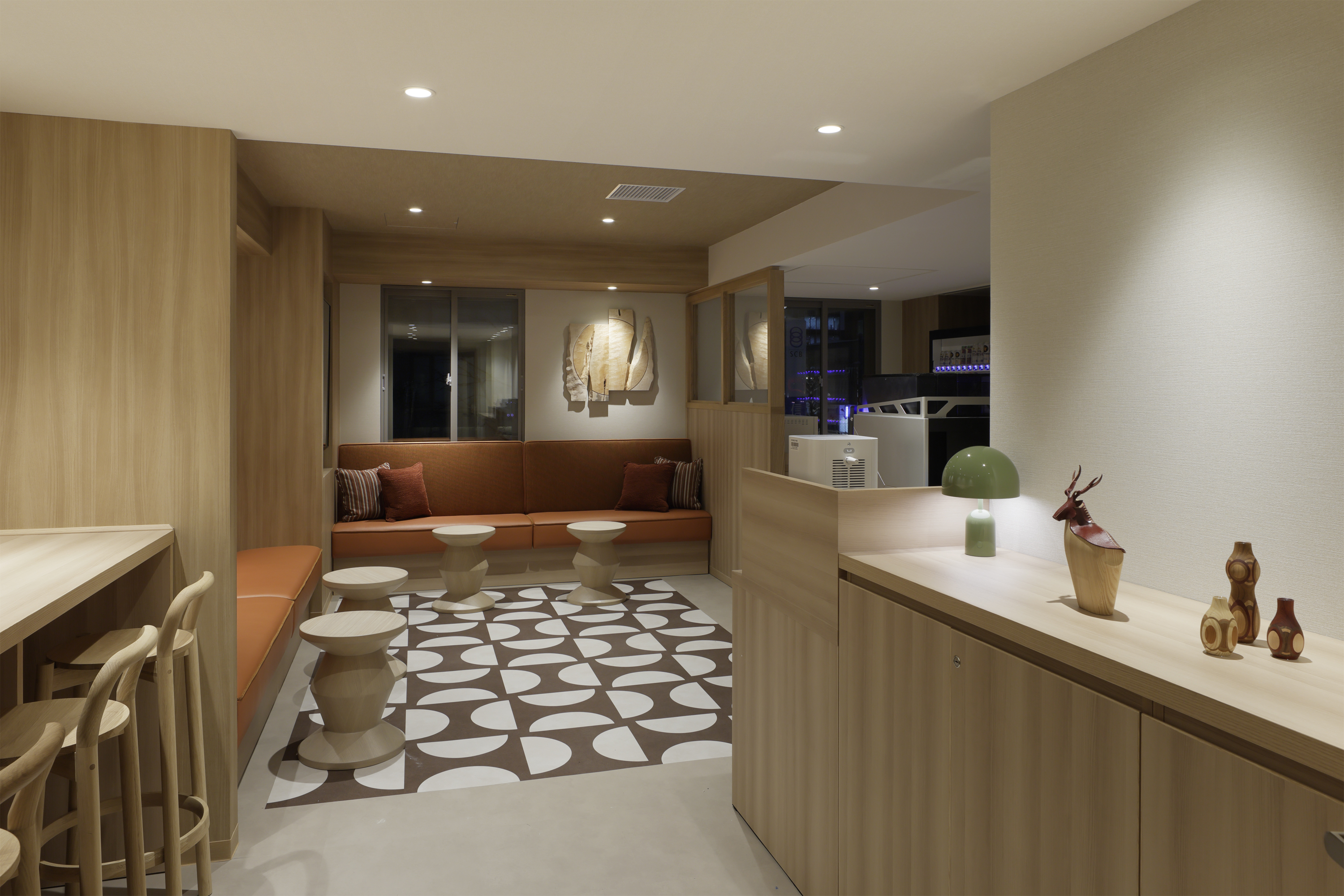 2階大浴場フロアには、滞在中の多様なニーズに応える「ユーティリティラウンジ」を新設。ラウンジ機能としてグループでくつろげるソファ、飲料や軽食を販売する自動販売機、コーヒーマシンを備えた休憩スペースを設置することで、客室以外の居場所として自由にご利用いただける滞在空間としました。加えて、洗濯機、電子レンジ、アイロンなどの生活機能を一か所に集約し、中長期滞在のゲストにとって必要な機能も備えました。