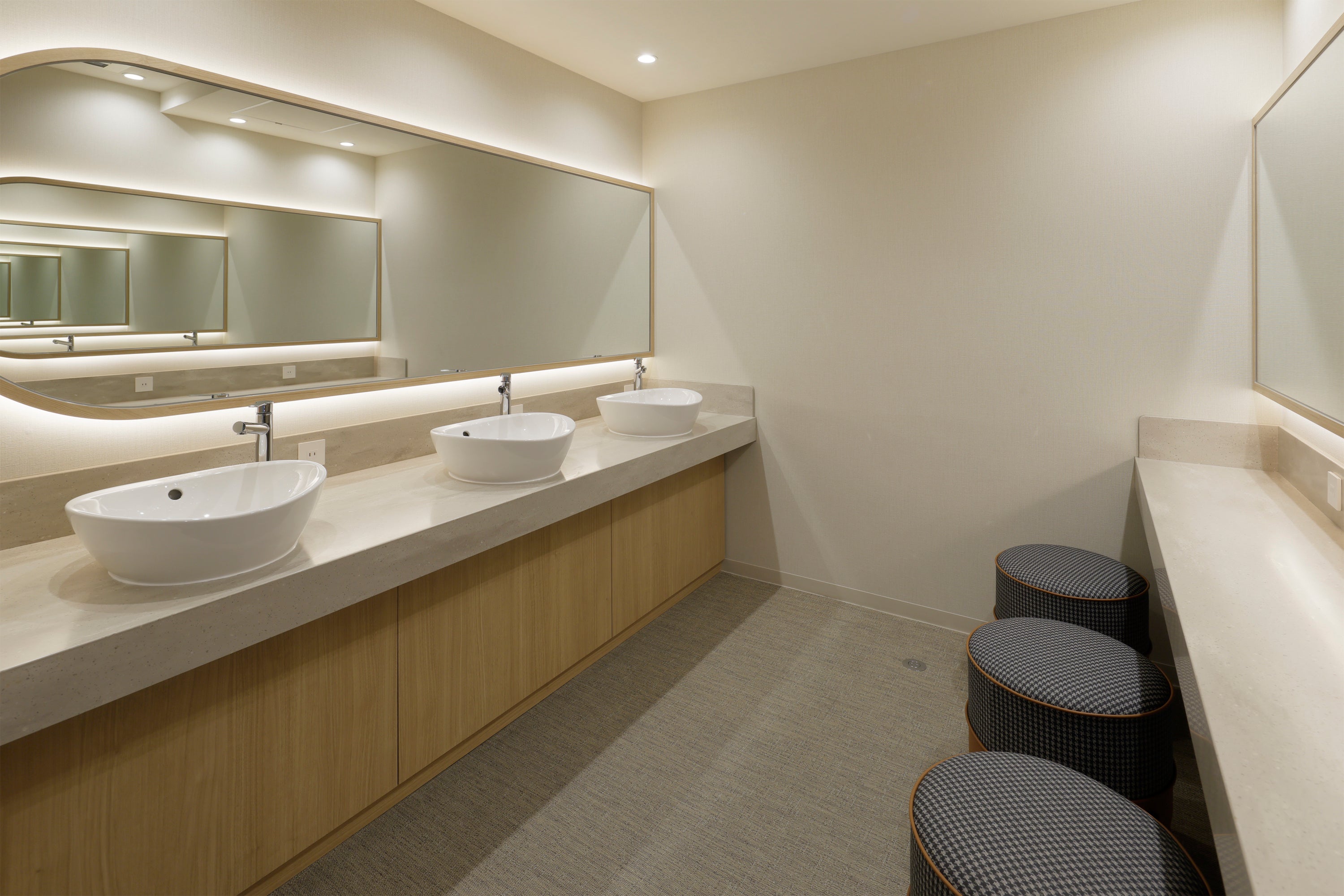 ご好評いただいておりました大浴場も全面リニューアルし、ローカリティと落ち着きを感じられるデザインに刷新しました。また、女性用脱衣室を拡張して洗面スペースやパウダースペースを増設し、より快適に身支度を行っていただけるゆとりある空間となりました。