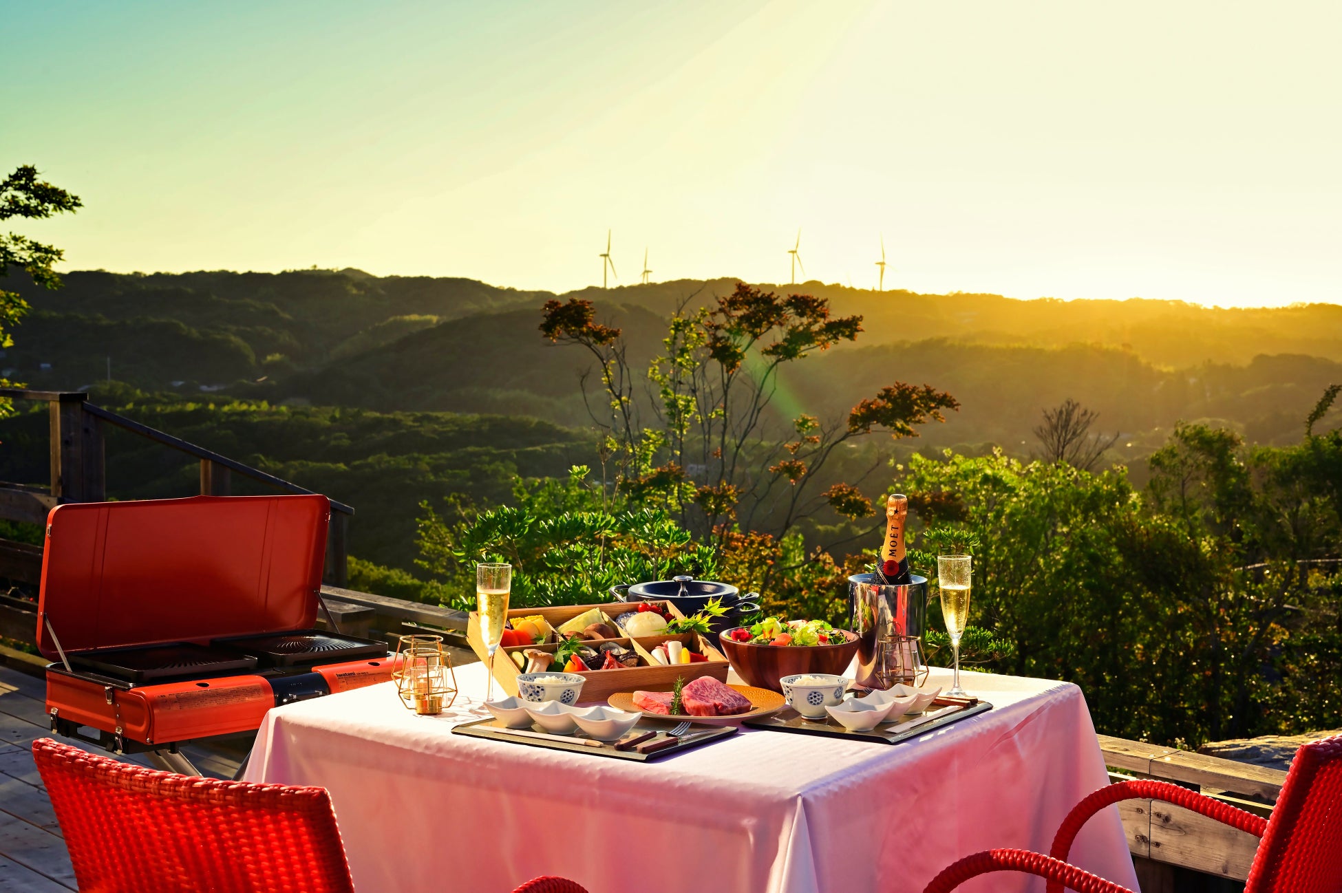 食材は、淡路島の年間200頭ほどしか取れない淡路ビーフ200g、淡路島産の玉ねぎ丸ごと1個などを絶景テラスで召し上がる「極上BQ」をお楽しみいただけます。