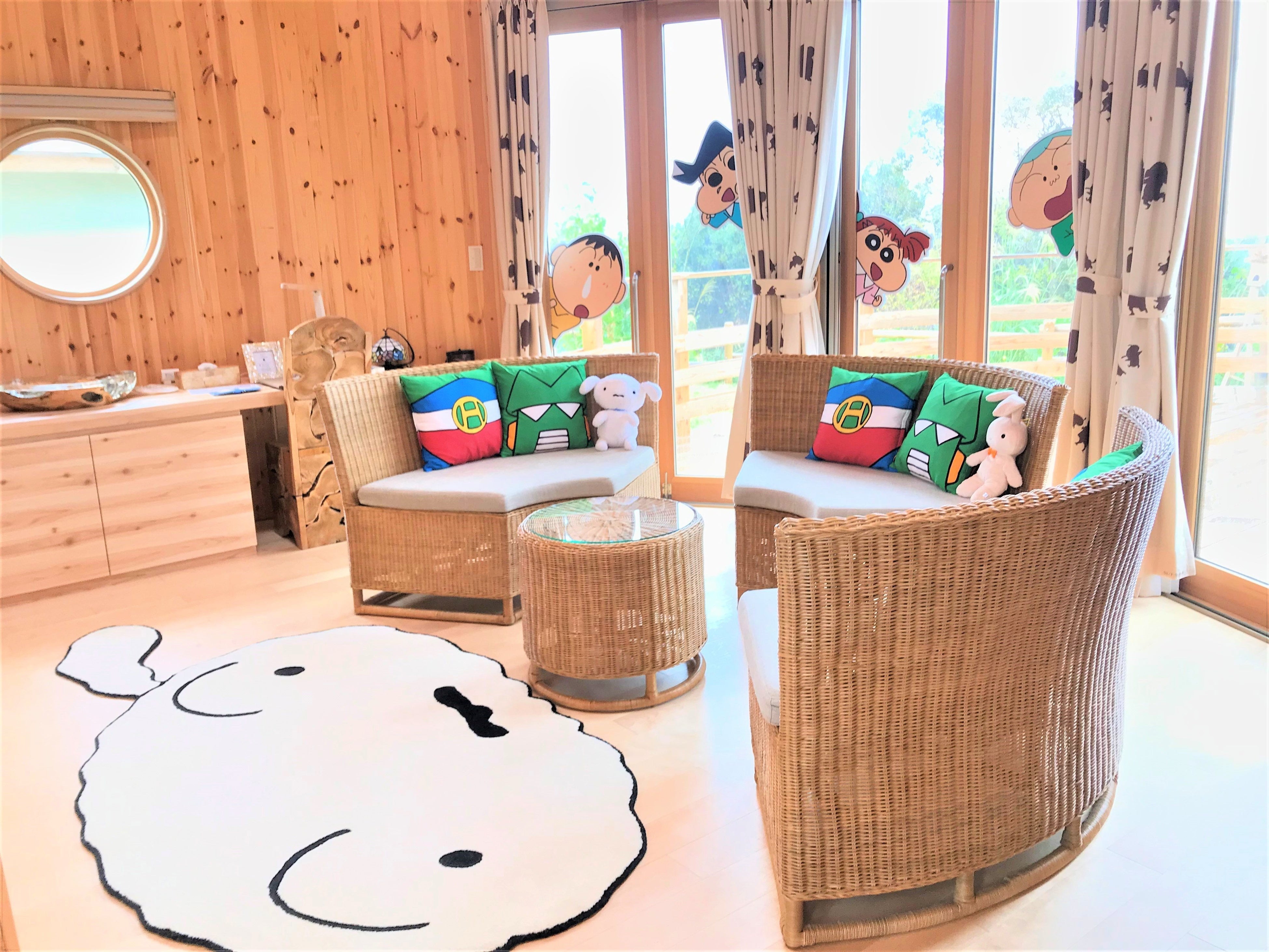 登場キャラクターである「しんのすけ」や「ひまわり」が高さ5mの天窓からお部屋を覗く様子や、大きなシロのラグマット、隠れぶりぶりざえもんの装飾などが施されており、「クレヨンしんちゃん」の世界を体験できるお部屋です。実際に作中で着用しているデザインをモチーフにしたパジャマ、大人用アクション仮面のコスチュームなど、大人も子ども楽しめる限定グッズもご用意しております。