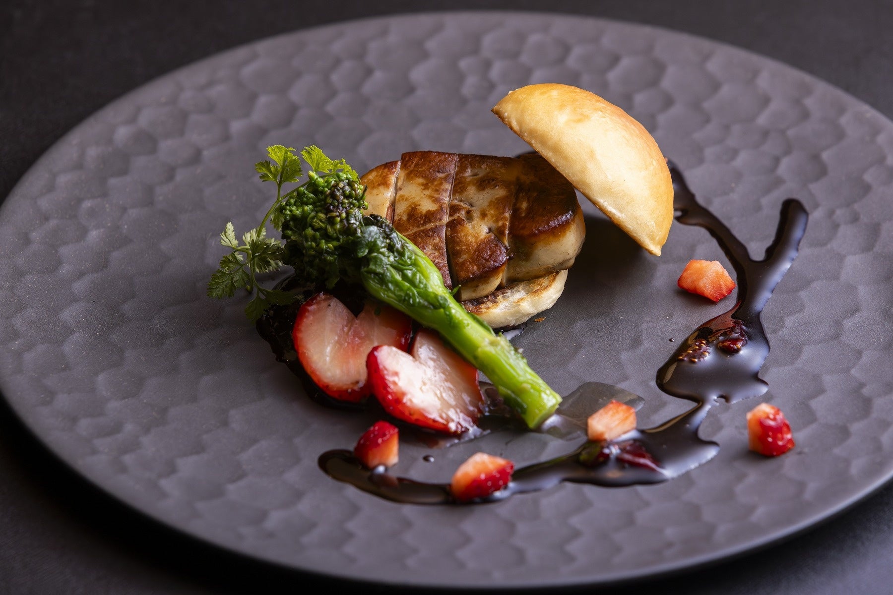 香ばしくソテーしたフォアグラに、軽やかな甘みのブリオッシュといちごを添え、赤ワインといちごを合わせた濃厚ソースで仕上げました。フォアグラのコクに、いちごの酸味が重なり合い、春らしい余韻を感じる味わいに。鉄板焼ならではのライブ感とともに、大人の味わいをご堪能ください。