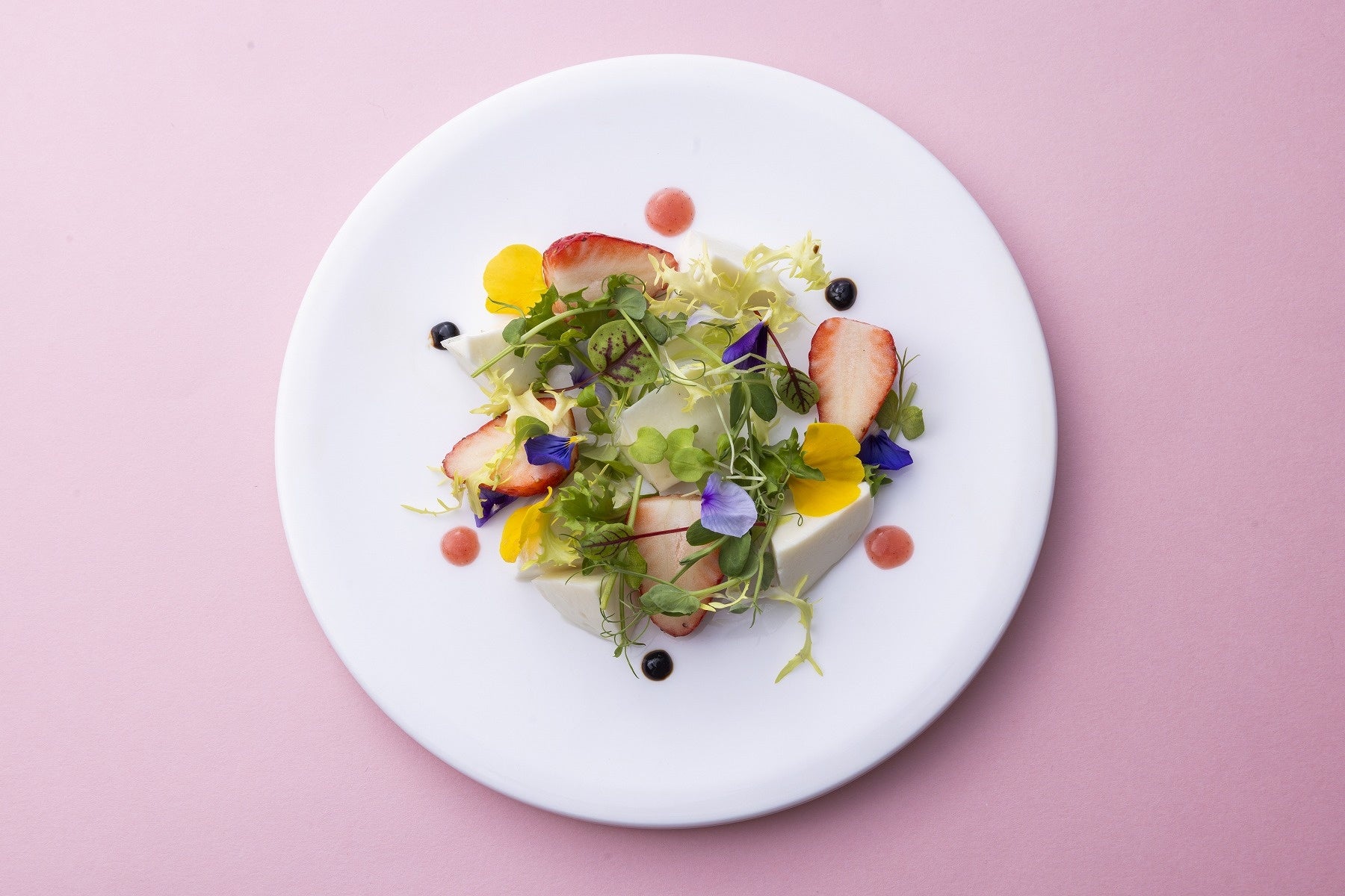 フレッシュないちごとモッツァレラチーズを合わせた、春らしいカプレーゼ。いちごの甘酸っぱさと、モッツァレラのコクが響き合い、シンプルながらも素材の魅力が際立つ一皿です。