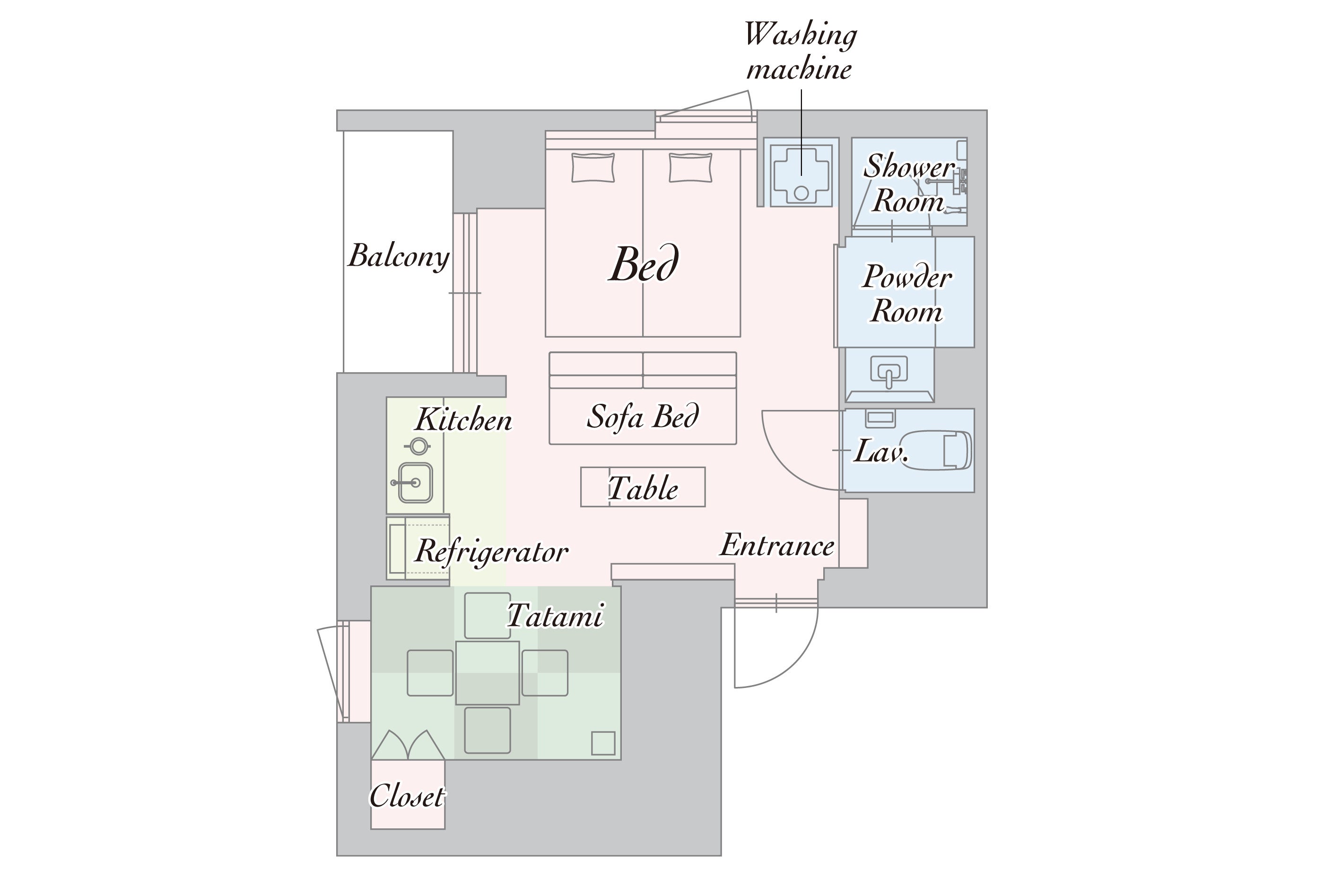 シンプルかつ機能的でありながら日本の美意識を生かした客室や、自炊可能なキッチンや自動洗濯乾燥機をはじめとした長期滞在者向けの設備など、お客様の快適な滞在を叶えるためのサービスを取り揃えています。